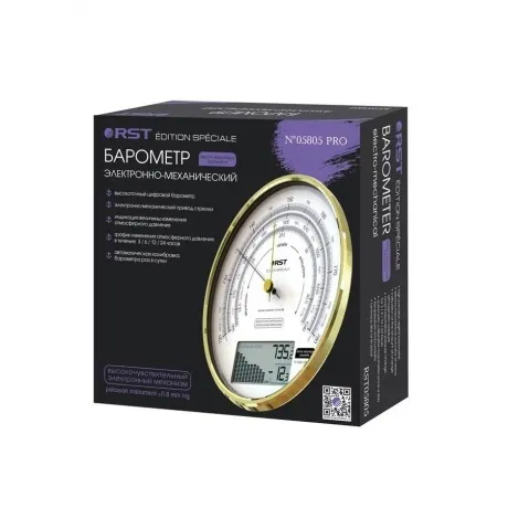 Барометр RST 5805 – компактный электронно-механический прибор с округлым золотистым корпусом. Данные отображаются в виде цифр и понятных графических символов. Вы можете сами выбрать наиболее удобные единицы измерения, а также провести ручную калибровку для получения максимально точной информации. Прибор RST 5805 действует от двух батареек AA-типа. При низком заряде система оповещает о необходимости смены элементов питания. Устройство обладает размерами 16.5x16.5x4 см и дополняется креплением для настенного монтажа. Атмосферное давление измеряется каждые 18 минут, а данные за последние (3, 6, 12 и 24) часы отображается в виде понятного графика.