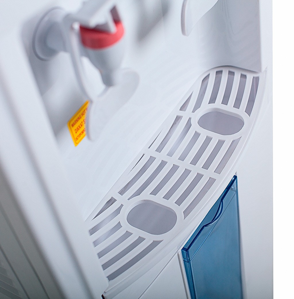HotFrost V118E — недорогой, но в то же время надежный кулер для воды, который станет идеальным решением для покупателя, делающего свой выбор в пользу выгодного сочетания «цена/качество». Для слива воды в кулере установлены краники нажимного типа, интуитивно понятные в использовании. Такой тип краников позволяет пользователю не напрягаться и не вникать в особенности работы с механизмом аппарата, а просто напиться воды, что, собственно говоря, и должен обеспечивать кулер. Наличие нажимных краников избавляет владельцев данной модели от излишних контактов с поверхностями кулера, что действительно очень гигиенично. Кроме этого, кулер оборудован откидным шкафчиком для хранения пластиковых стаканчиков. Эти факторы позволяют использовать этот кулер в местах массового скопления людей.