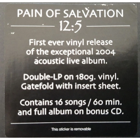 Впервые на виниле, первый концертный альбом шведской прог-метал-группы Pain of Salvation, 12: 5. Он был выпущен в 2004 году и был записан на концерте в родном городе группы Эскильстуна, Швеция, 12 мая 2003 года.. В то время как шведские пионеры и новаторы прогрессив-метала, Pain of Salvation, продолжают бросать вызов и преодолевать стилистические границы в своих передовых альбомах (из последнего: PANTHER, 2020), InsideOutMusic продолжает переработку всеобъемлющего новаторского бэк-каталога группы: таким образом, классический концептуальный альбом 2004 года «BE» и исключительный акустический концертный альбом 2004 года «12:5» теперь впервые становятся доступны на виниле. Оба релиза выходят в на двойных 180-граммовых пластинках в гейтфолде с вкладышем и полный альбом на бонусном компакт-диске, что делает их незаменимыми предметами для любого поклонника и коллекционера Pain of Salvation, а также особым открытием для непредубежденных поклонников прогрессивной музыки, ищущих настоящие жемчужины жанра. И будьте осторожны, скоро выйдет еще больше Pain of Salvation…