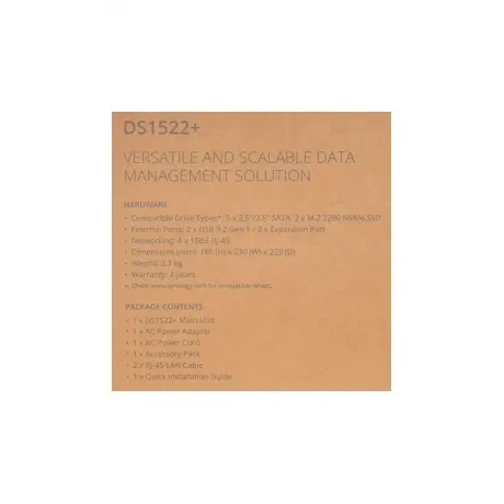 Рассчитанное на настольную установку сетевое хранилище (NAS) Synology DiskStation DS1522+ оснащено 5 отсеками для 3.5-дюймовых и 2.5-дюймовых накопителей. Также в наличии 2 слота для SSD NVMe, используемых для кеширования. Организация кеш-памяти с использованием высокопроизводительных твердотельных накопителей позволяет существенно увеличить и без того высокую производительность устройства. Модель станет отличным выбором для корпоративных пользователей, желающих получить быстро работающее и отказоустойчивое хранилище информации, отличающееся существенной вместительностью. Максимально поддерживаемый объем одного накопителя составляет 18 ТБ. Воспользовавшись опциональными модулями расширения, можно увеличить количество используемых накопителей до 15. Сетевое хранилище (NAS) Synology DiskStation DS1522+ поддерживает массивы JBOD, Synology Hybrid RAID, RAID 5, RAID 0, RAID 6, RAID 1 и RAID 10. Также поддерживается режим Basic, в котором используется единственный накопитель. Объем оперативной памяти хранилища может быть увеличен вчетверо (со стартовых 8 ГБ до 32 ГБ).