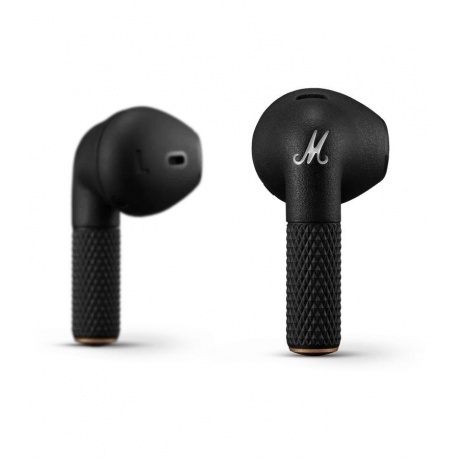 Наушники TWS Marshall Minor III поставляются с зарядным кейсом. Он выполнен из черного пластика с фактурной отделкой, которая по внешнему виду и тактильным свойствам имитирует кожу. Наушники имеют нескользящую рельефную насечку на корпусе и золотистые накладки. Закрытая акустическая система с 12-мм динамиками обеспечивает детализированное насыщенное звучание. Встроенный микрофон передает чистый голос собеседнику в процессе общения. Корпус устройства защищен от брызг воды по стандарту IPX4, поэтому подходит для активных занятий спортом и использования в разных погодных условиях. Для синхронизации со смартфоном применяется беспроводной интерфейс Bluetooth 5.2. Нажатием сенсорных кнопок можно переключать треки, отвечать на звонки, ставить музыку на паузу. Встроенный в каждый наушник Marshall Minor III аккумулятор гарантирует до 5 часов работы без подзарядки. Кейс увеличивает автономность до 25 часов.