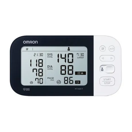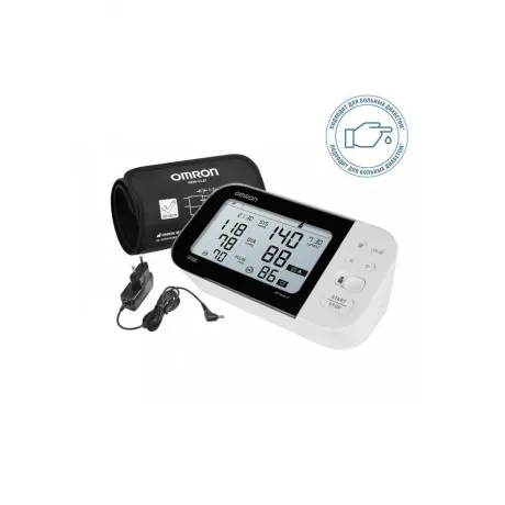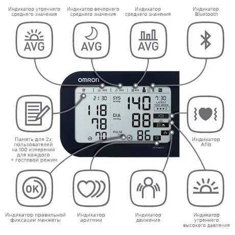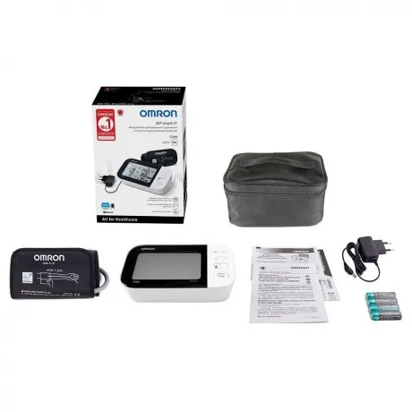 OMRON M7 Intelli IT – многофункциональный автоматический тонометр на плечо c технологией Afib для определения мерцательной аритмии в комплектации с умной манжетой Intelli Wrap Cuff и адаптером. Кроме индикаторов повышенного артериального давления и нерегулярного сердцебиения, в тонометре присутствует индикатор мерцательной аритмии. Предусмотрены индикаторы правильной фиксации манжеты и движения.