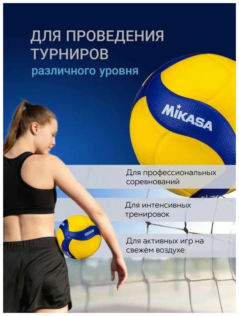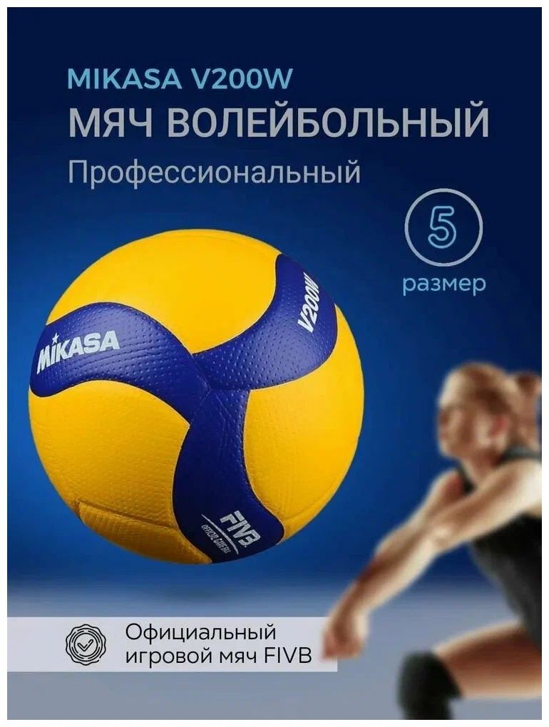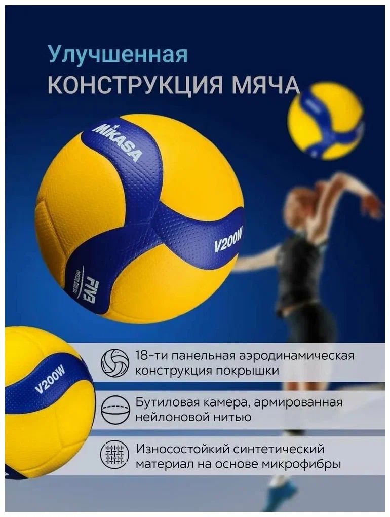 Профессиональный мяч MIKASA V200W - официальный мяч FIVB (Международная Федерация Волейбола) и Кубка Мира по волейболу 2019 в Японии, а также это официальный мяч Олимпийских Игр 2020 года, которые будут проходить в Токио. Мяч одобрен FIVB и подходит для проведения соревнований высшего уровня. Конструкция мяча MIKASA V200W состоит из 18-ти панелей, склеенных между собой, что улучшает аэродинамику полета. Двухуровневая поверхность из микроволокна стабилизирует траекторию полета и создает дополнительный мягкий контроль. Благодаря новому дизайну улучшается видимость мяча на площадке теперь в нем еще больше желтого цвета. MIKASA V200W выполнен из синтетической кожи на основе микрофибры. В данной модели применена технология Nano Ballon Silica, благодаря которой предотвращается скольжение поверхности мяча во время интенсивной игры. Поверхность мяча, как и у предшествующей модели MVA200, с небольшими углублениями Double-Dimple (диаметр 2мм, глубина 0,2-0,3мм), что обеспечивает большую площадь соприкосновения и максимальный контроль мяча, более высокий отскок при меньшей силе удара. Камера изготовлена из бутила.