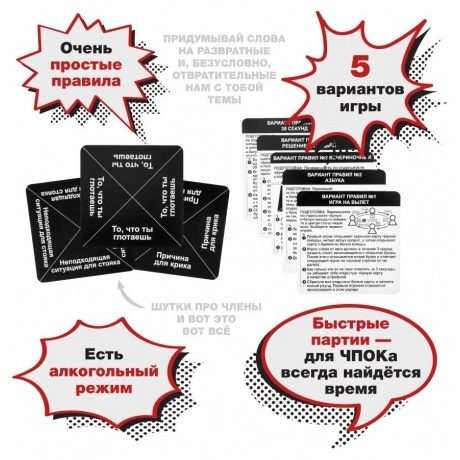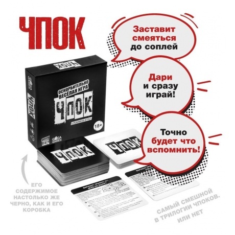 Что такое Чпокx Это смесь чёрного юмора, развратных слов, пошлых тем и похабных шуток, которые ваши друзья будут припоминать весь следующий год. Алкоголь не обязателен, но может усилить удовольствие. Главное — это отринуть стыд и смело составить из букв «Ж», «О», «П», «А» слово «ВЕЧНОСТЬ».