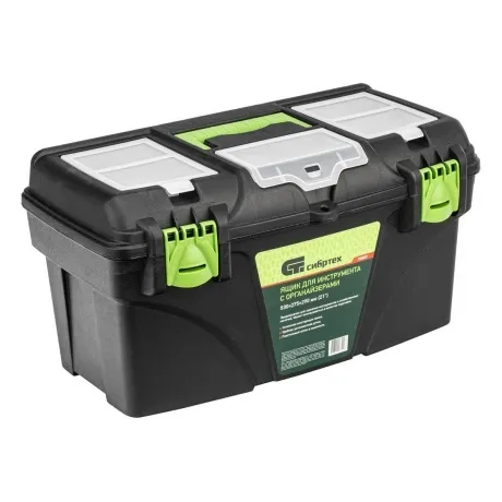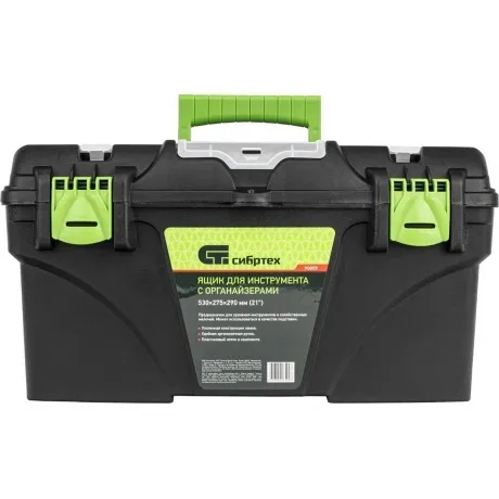 Ящик Сибртех 90809, 21 дюйм, с органайзерами, используется для хранения и транспортировки инструментов, оснастки, крепежей, хозяйственных мелочей и других предметов. Крышка и замок усилены трехрядными петлями, поэтому он выдерживает вес содержимого до 50 кг. Ящик можно брать в поездку, также он пригодится дома, на даче или в гараже.