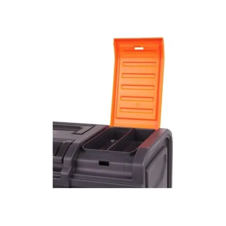 Ящик для инструментов, усиленный 19 STELS 90762 имеет съемный лоток, а так же снаружи крышки предусмотрены дополнительные отделения. Все это обеспечивает удобство разделения различных мелочей по видам. Усиленная конструкция выдерживает вес при переноске 35 кг, что позволяет использовать ящик для транспортировки электроинструмента. Максимальная распределенная нагрузка на крышку 150 кг.