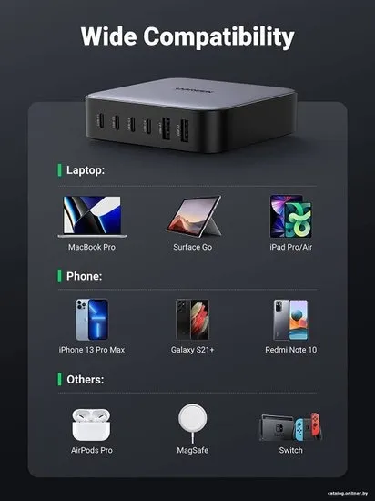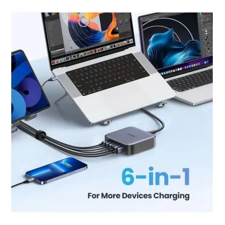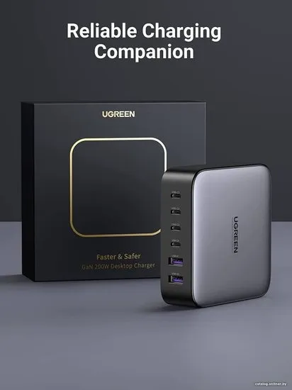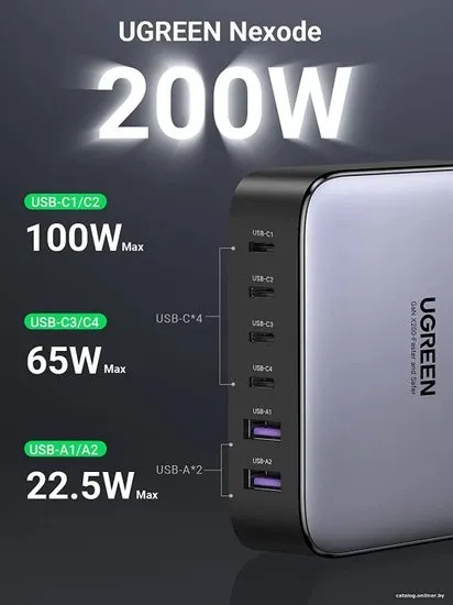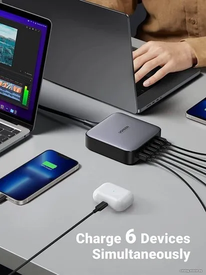Зарядное устройство для телефонов Ugreen — это высокопроизводительное решение для полноценной и быстрой подзарядки множества устройств одновременно. Это сетевое зарядное устройство обладает суммарной выходной мощностью в 200 Вт, что обеспечивает эффективную и быструю подзарядку благодаря поддержке технологии быстрой зарядки.