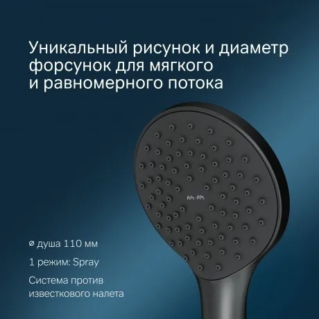Трендовый дизайн: четкие, но вместе с тем изящные, запоминающиеся с первого взгляда продукты. Уникальный рисунок и диаметр форсунок – дизайн обеспечивает максимум удовольствия от душа и равномерное распределение воды при любом напоре. Продуманные детали для удобства использования: шарнирное соединение защищает душевой шланг от перекручивания, регулируемый в трех плоскостях держатель ручного душа, функция Rub&Clean для легкой очистки душевых форсунок. Один режим ручного душа.