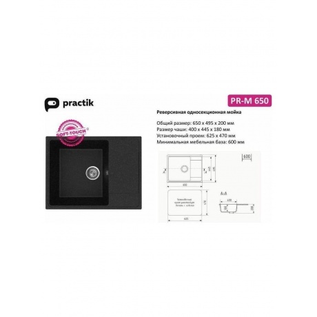 Классическая односекционная реверсивная мойка Practik PR-650 с плоским крылом является оборачиваемой - крыло может располагаться как справа, так и слева. Материал мойки представляет из себя искусственный камень, который является композитом на основе натурального мрамора и связующих смол. Искусственный камень существенно снижает уровень шума при падении струи воды. Специальное покрытие гелькоут защищает поверхность мойки от загрязнений и бытовых царапин, делая уход за мойкой легким и простым. Данная мойка устанавливается в шкаф от 60 см и дает возможность осуществить монтаж мойки в стандартную столешницу шириной 60 см.