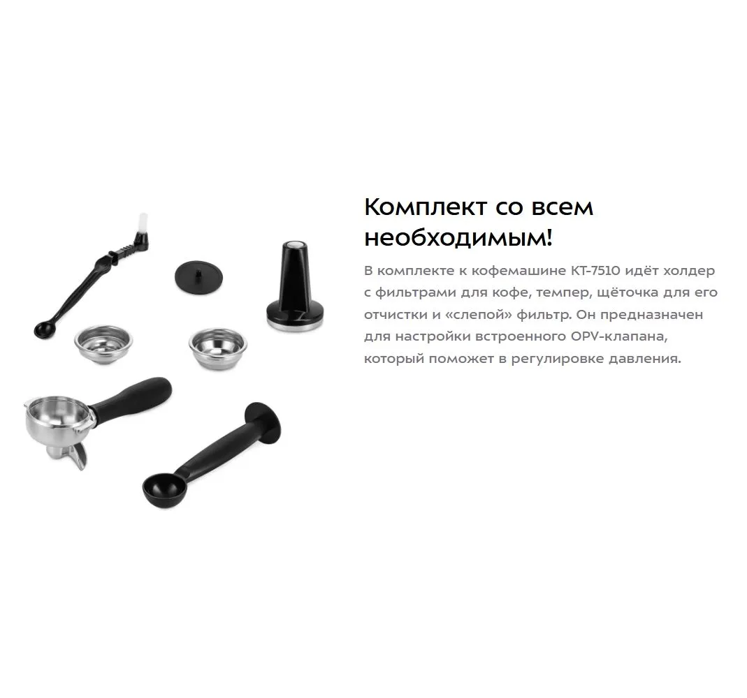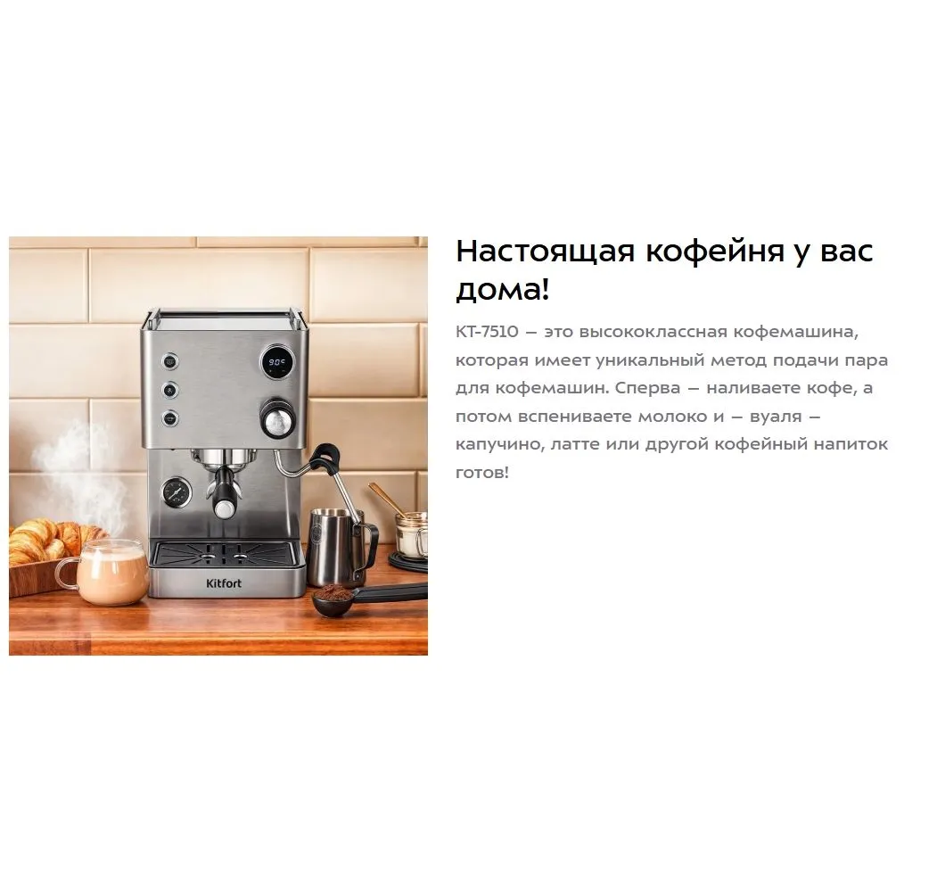 Настоящая кофейня у вас дома!. КТ-7510 – это высококлассная кофемашина, которая имеет уникальный метод подачи пара для кофемашин. Сначала – выбираете нужную порцию эспрессо, а потом вспениваете молоко и – вуаля – капучино, латте или другой кофейный напиток готов!