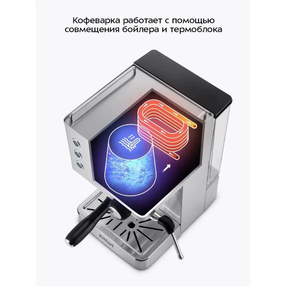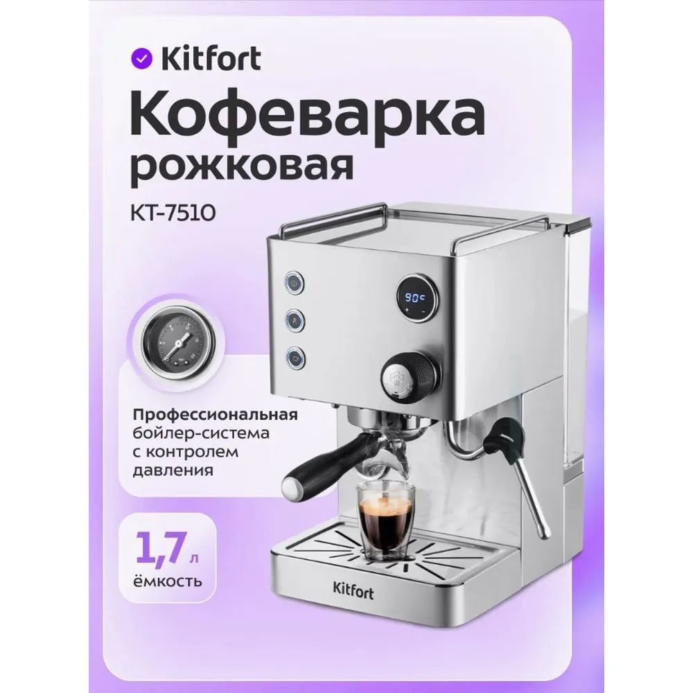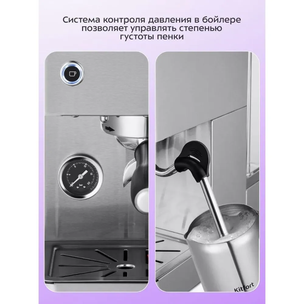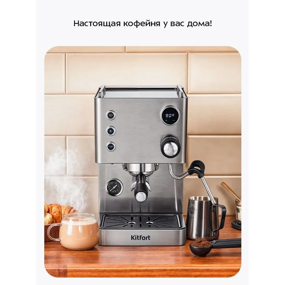 Кофеварка рожковая Kitfort КТ-7510 - описание товара, его характеристики, фото и цены представлены на карточке товара. Чтобы купить этот товар по цене 45990 руб., свяжитесь с нами по телефону 8(800)505-43-75 в Краснодаре, или оформите покупку через корзину.