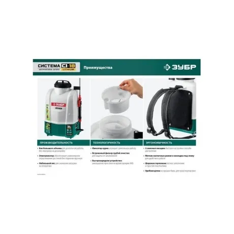 Аккумуляторный опрыскиватель ЗУБР 15 л ОПЛ-15 отличается эффективностью, мобильностью, экологичностью. Бережно орошает растения. Подходит для дезинфекции, мытья окон и стен. Работает от литий-ионного аккумулятора напряжением 18 В (приобретается отдельно). За счет наличия ремней обеспечивается удобство переноски на спине.