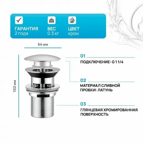 Приспособление для наполнения раковины водой плотно прилегает к сливу. Легкое управление путем нажатия пробки: один раз чтобы закрыть слив ещё раз - чтобы спустить воду. Подходит для раковин с переливом имеет соединение G1 1/4