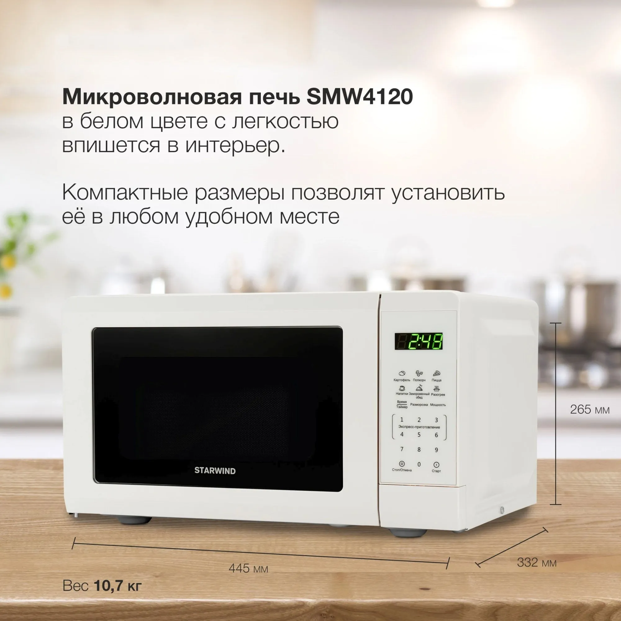 Микроволновая печь StarWind SMW4120 предназначена для приготовления, разморозки и разогрева пищи максимальным объемом до 20 литров. Прибор в белом корпусе характеризуется актуальным дизайном и не займет много места на кухне. Устройство оснащено механическим интуитивно понятным управлением и не требует специальных навыков от пользователя. Есть возможность активировать приготовление блюда в автоматическом режиме с минимальным вмешательством в процесс пользователя. В модели предусмотрен режим авторазморозки. Дверца СВЧ-печи открывается при помощи кнопки. За процессом готовки можно наблюдать через жаропрочное стекло.