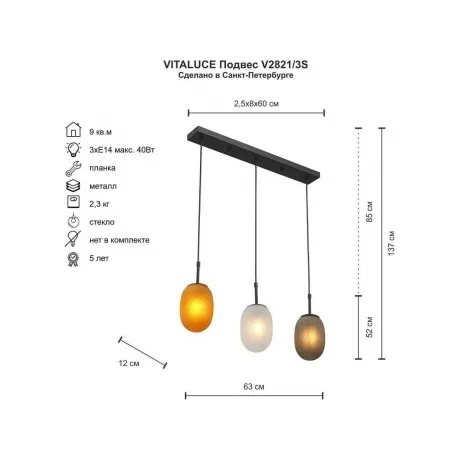 люстра подвесная vitaluce v2821/3s на три лампы под цоколь e14 в стиле модерн с черным металлическим каркасом и стеклянными плафонами, максимальная мощность лампы 40 вт, подходит для накаливания и светодиодных ламп.