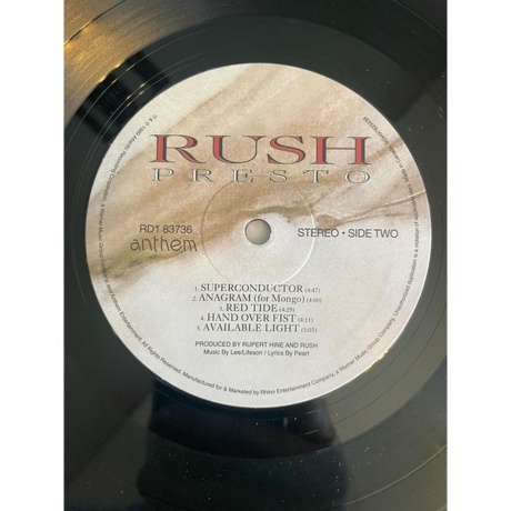 Presto — тринадцатый студийный альбом канадской рок-группы Rush, выпущенный в 1989 году. Издание на виниле. В поддержку альбома было издано три сингла: «The Pass», «Superconductor» и «Show Don’t Tell», последний достиг вершины хит-парада Hot Mainstream Rock Tracks. Сам альбом добрался до 16 строчки в Billboard 200 и получил «золотую» сертификацию в США. На родине музыкантов альбом получил «платиновый» статус. Rush — канадская прогрессив-рок-группа, включающая басиста, клавишника и вокалиста Гедди Ли, гитариста Алекса Лайфсона, а также барабанщика и поэта Нила Пирта. Rush одни из первых в прогрессив-роке начали привносить в свою музыку элементы хард-рока и хеви-метала, став предтечами прог-метала. Музыка Rush являлась источником вдохновения для творчества таких групп, как Metallica, Primus, Rage Against the Machine и The Smashing Pumpkins, а также современных групп прог-метала, таких как Dream Theater и Symphony X. Более 40 миллионов проданных альбомов за 40 лет и постоянно распродаваемые туры сопровождают группу, которая является одним из самых инновационных и популярных рок-феноменов в мире.