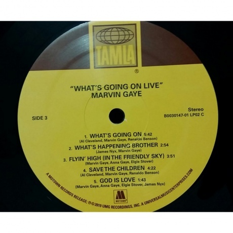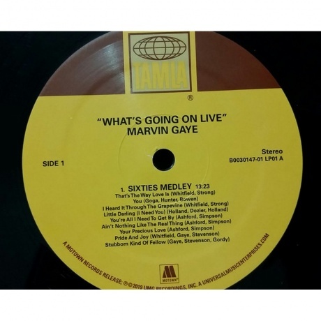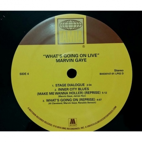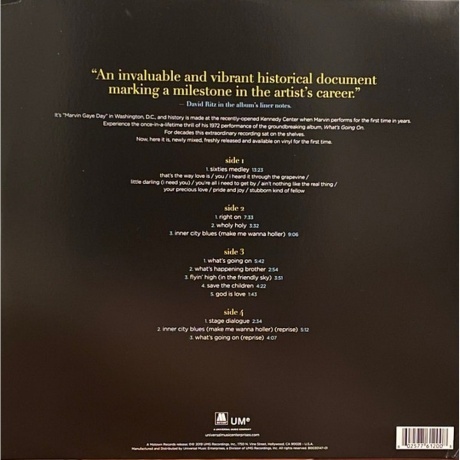 1. LP 1 Sixties Medley: That's The Way Love Is / You / I Heard It Through The Grapevine / Little Darling (I Need You) / You're All I Need To Get By / Ain't Nothing Like The Real Thing / Your Precious Love / Pride And Joy / Stubborn Kind Of Fellow, 2. Right On, 3. Wholy Holy, 4. Inner City Blues (Make Me Wanna Holler), 5. LP 2 What's Going On, 6. What's Happening Brother, 7. Flyin' High (In The Friendly Sky), 8. Save The Children, 9. God Is Love, 10. Stage Dialogue, 11. Inner City Blues (Make Me