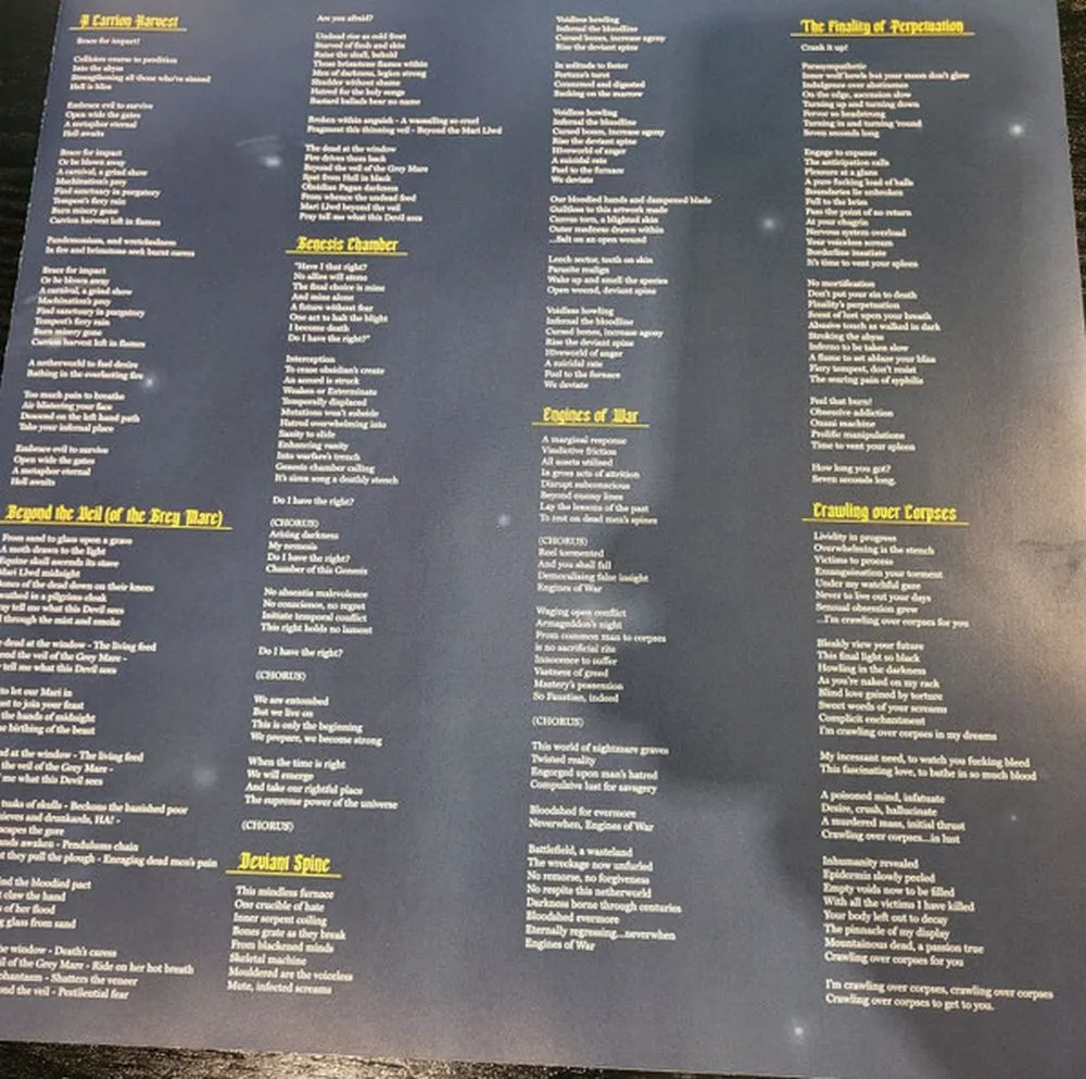 Лицензионное издание, выпущенное на виниле. В альбом вошли следующие композиции: A Carrion Harvest, Beyond the Veil (of the Grey Mare), Genesis Chamber, Deviant Spine, Engines of War, The Finality of Perpetuation, Crawling over Corpses, In the Dread of the Night, Drought of Mercy, Psychosister, Ravage Of Empires