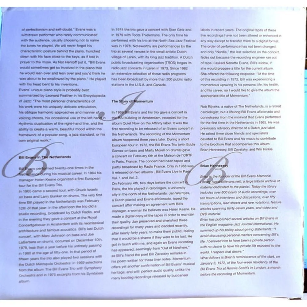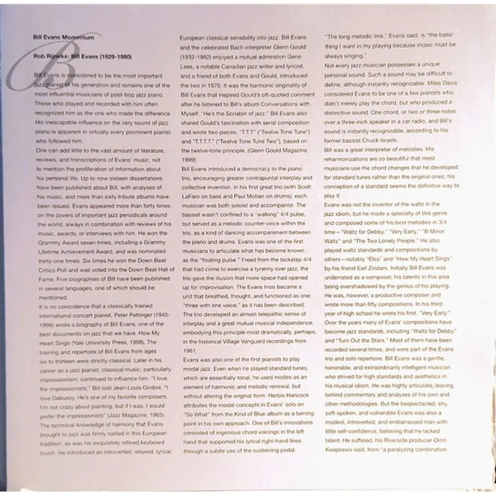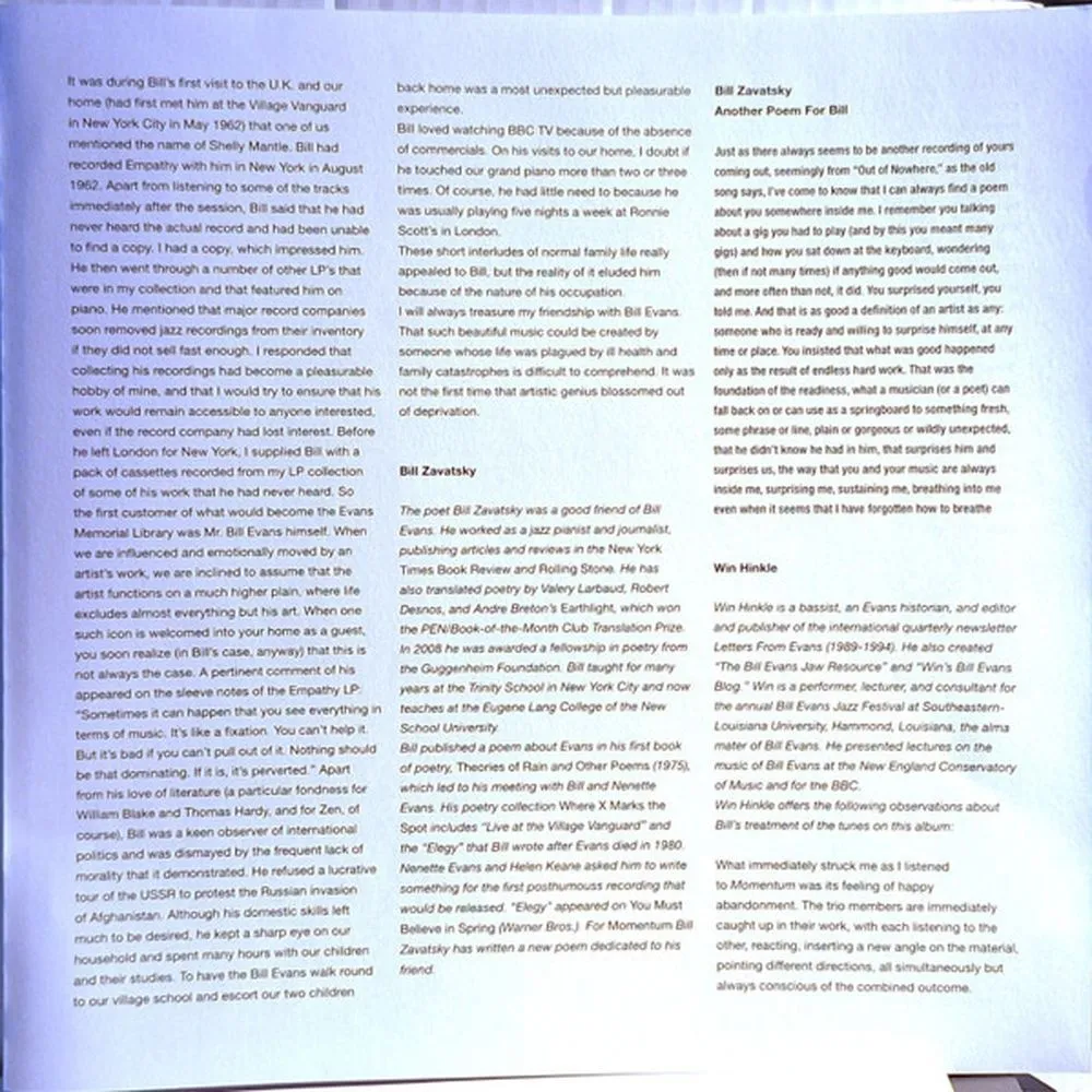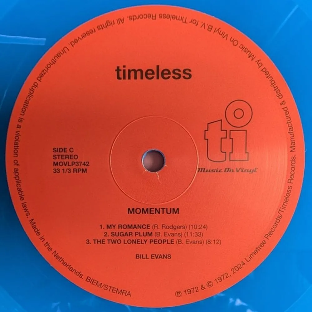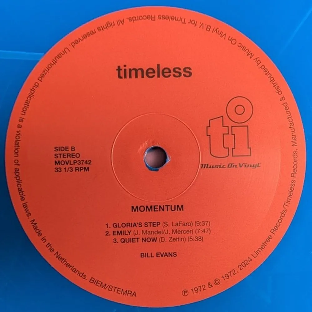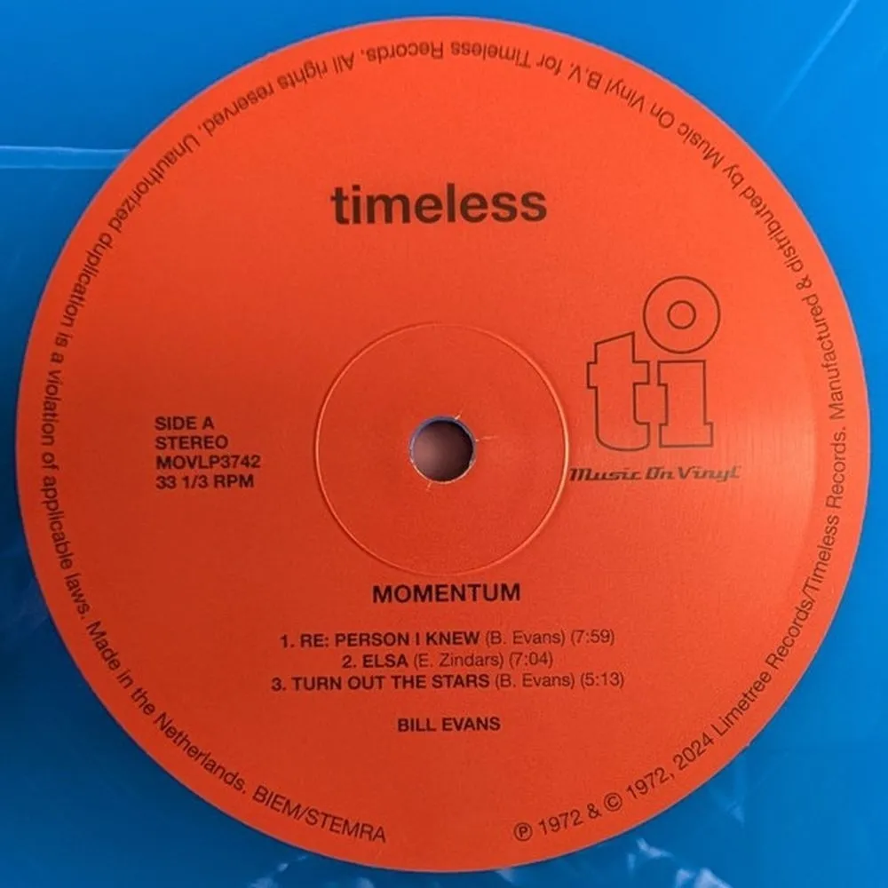 2LP — ограниченный тираж синего винила плотностью 180 г. Тираж всего 1000 экземпляров. Альбом « Momentum » известного джазового исполнителя Билла Эванса – концертный альбом 1972 года, записанный на концерте в Stadsschouwburg в Гронингене, Нидерланды. В состав трио, помимо Билла Эванса (фортепиано), входят Эдди Гомес (бас) и Марти Морель (ударные). Ансамбль исполняет композиции Билла Эванса, « Nardis » Майлза Дэвиса и « What Are You Doing The Rest Of Your Life » Мишеля Леграна. Альбом получил престижную немецкую премию Preis Der Deutschen Schallplattenkritik. «Momentum» выпущен ограниченным тиражом в 1000 экземпляров на синем виниле.