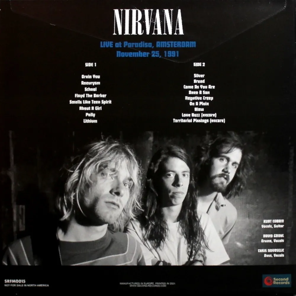 "Live At Paradiso, Amsterdam - November 25, 1991" - концертное выступление группы Nirvana в ноябре 1991 года в клубе Paradisо в Амстердаме. Бутлег. Издание на 180-гр бирюзовом виниле. Nirvana - американская рок-группа, созданная в 1987 году гитаристом и вокалистом Куртом Кобейном и басистом Кристом Новоселичем. Успех пришёл в 1991 году с выпуском песни "Smells Like Teen Spirit", после этого группа приобрела культовый статус. За недолгое время существования (коллектив распался в 1994 году после смерти Курта Кобейна) команда выпустила 3 студийных и 3 концертных альбома, а также несколько сборников. Общий тираж пластинок перевалил за 50 миллионов копий.