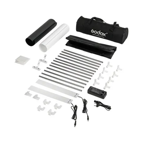 Фотобокс Godox LSD40 с LED подсветкой это готовая мини-студия для фотографирования небольших объектов, внутренний размер фотобокса 40?40?40 см. Используется в предметной съёмке: для печатных каталогов, интернет-магазинов и т. д. Компактность фотобокса в сложенном состоянии позволяет хранить его в любом шкафу. Также фотобокс отличается простотой сборки и разборки, использование инструмента для этого — исключено. Конструкция представляет собой трубчатый каркас с надетым на него кожухом с внутренними серебристыми отражающими поверхностями. На гранях кожуха фотобокса есть три отверстия закрытые клапанами на липучке. Два больших отверстия расположены на передней и верхней гранях фотобокса и предназначены для фотографирования объектов с разных ракурсов. Маленькое отверстие (на верхней грани) предназначено для заведения кабелей питания светодиодных линеек внутрь фотобокса. Фотографирование предметов также можно осуществлять полностью откинув переднюю грань фотобокса. Крепление светодиодных линеек производится за счёт пластиковых клипс (предусмотрены в комплекте) на верхние либо на вертикальные рёбра внутрь фотобокса (для крепления на вертикальные трубки и на горизонтальные предназначены разные клипсы). Для получения более рассеянного света, в комплекте предусмотрен тканевый светорассеиватель, фиксация которого осуществляется за счёт резиновых петель к трубчатому каркасу фотобокса. Для получения более качественного светотеневого рисунка — положение светорассеивателя можно регулировать по высоте. В комплекте предусмотрено два пластиковых полуматовых фона. Цвета фонов: чёрный и белый. Крепление фона к каркасу производится двумя комплектными прищепками. Освещение фотобокса осуществляется двумя мощными светодиодными линейками. С помощью кабеля со штекером, каждая линейка подключается к адаптеру питания Godox LSC2. Раздельная регулировка яркости линеек и их выключение производится за счёт двух диммеров, находящихся на корпусе адаптера питания. Суммарная мощность всех светодиодов составляет 40 Вт. Цветовая температура осветителей — 5800 К ± 200 К. Индекс цветопередачи CRI составляет более 96. Для хранения и транспортировки в комплекте предусмотрена мягкая нейлоновая сумка-чехол на молнии с ручками.