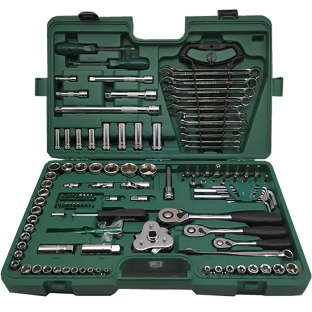 Состав: Набор удлиненных шестигранников 1.5, 2, 2.5, 3, 4, 5, 6, 8, 10 мм, Головки 6 г 1/4: 4, 5, 6, 7, 8, 9, 10, 11, 12, 13 мм, Глубокие головки 1/4: 8, 9, 10, 12 мм, Рукоятки-трещотки реверсивные 1/4, 1/2, 3/8, Удлинитель 1/4 50 мм, Держатель для бит магнитный 1/4, Адаптер для битов 1/4, Шарниры карданные 1/4, 3/8, 1/2, Головки 6 гр. 3/8: 9, 10, 11, 12, 13, 14, 15, 16, 17, 18, 19мм, Глубокие головки 6 гр. 3/8: 13, 14, 15, 17 мм, Головки Е-формы 3/8: Е8, Е10, Е11, Е12, Е14, Е16, Е18, Е20, Удлинители 3/8 75мм, 150мм, Адаптеры 3/8F x 1/4M, и 3/8F X 1/2M, Свечные головки 16, 21мм 3/8, Головки 6 гр. 1/2: 20, 21, 22, 24, 27, 30, 32 мм, Удлинители 1/2: 125мм, 250мм, Насадки 3/8: Шлиц 4, 5.5мм, PH #1, #2, Pz#1, #2, TORХ Т20, Т30, Т40, 45, Т50, Т55, Т60 HEX 3, 4, 5, 6мм, Ключи комбинированные 8, 9, 10, 11, 12, 13, 14, 16, 17, 18, 19 мм, Тестер автомобильный, Съемник фильтра 63-102 мм, Отвертки шлицевая 6 мм х 150 мм, крестовая PH # 2 х 100 мм, Набор бит 1/4 — 18 шт.