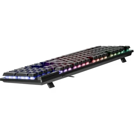 Радужная подсветка. Угол наклона клавиатуры регулируется с помощью ножек. Влагоустойчивая конструкция клавиатуры. Возможность выключения подсветки. Увеличенная площадь клавиш-модификаторов (Ctrl, Shift), клавиш Enter и BackSpace.