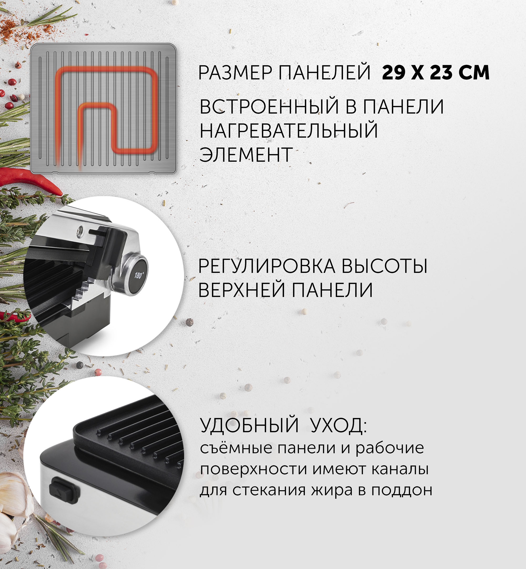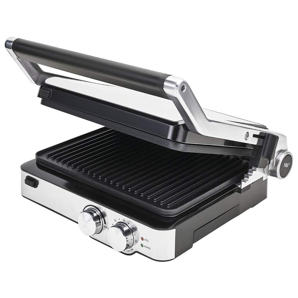 антипригарное покрытие,съемные плитки,таймер,регулировка температуры,емкость для сбора жира