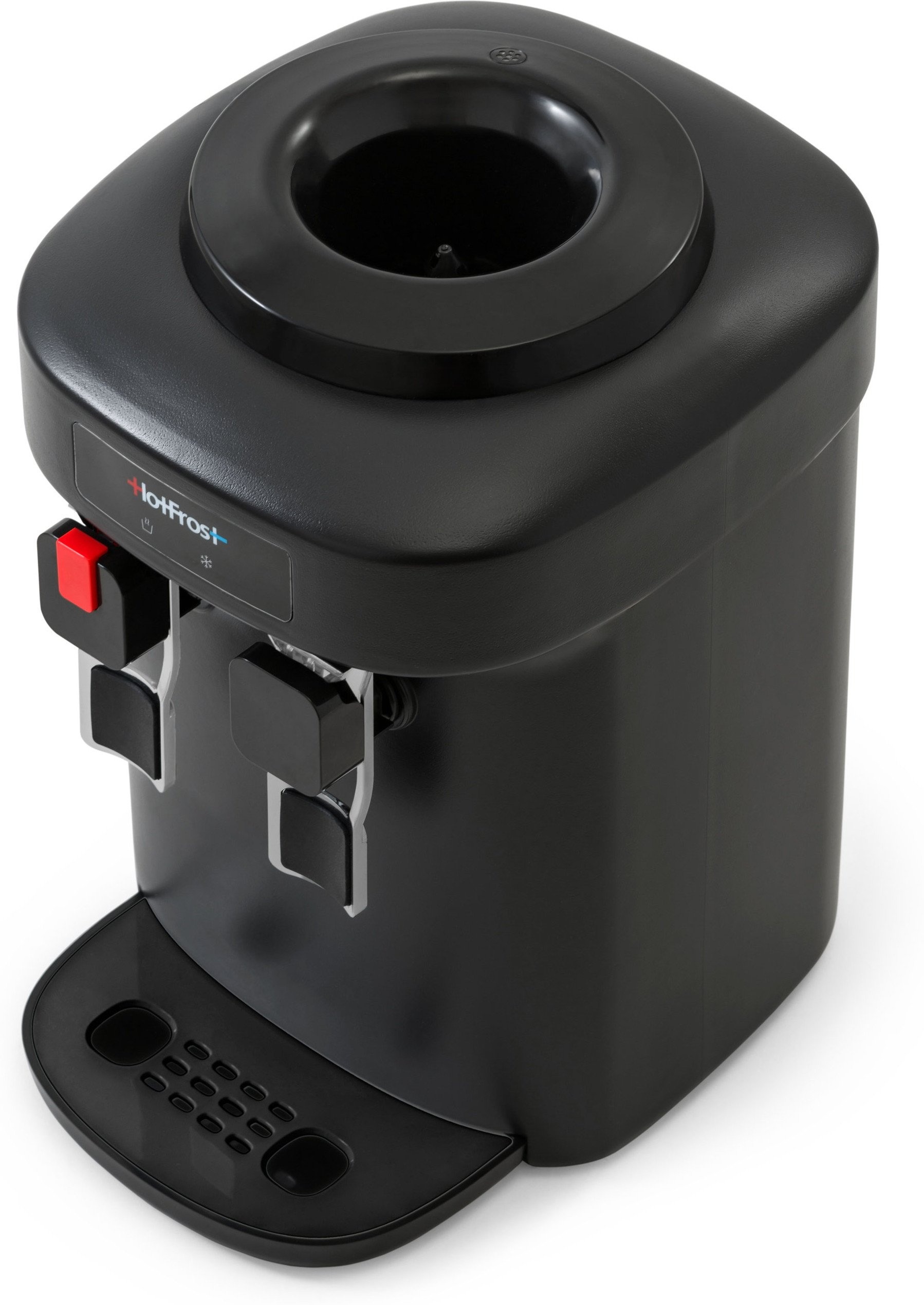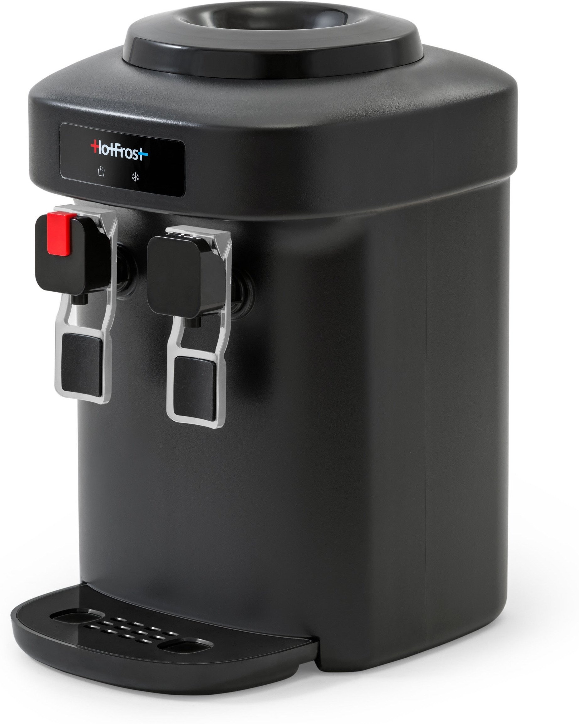 Диспенсер HotFrost D65EN представлен в стильном обтекаемом дизайне с черной расцветкой корпуса. Прибор обладает двумя емкостями для горячей и холодной воды на 0.8 и 0.6 л. Нагрев воды осуществляется до температуры 90 градусов, а охлаждение до 10 градусов. Кулер дополнен системой защиты от детей и съемным лотком для сбора капель. Модель HotFrost D65EN обладает электронным типом охлаждения. Работа осуществляется при мощности 420 Вт при нагреве и 80 Вт при охлаждении. Предусматривается наличие простого механизма управления в виде крана с нажимом кружкой, а также небольшого шкафчика. Комфортной работе способствует размещение бутыли на кулере, а также наличие визуально понятных индикаторов нагрева и охлаждения. Устройство весит 4 кг и обладает компактными габаритами, равными 27.3x41.1x30 см.
