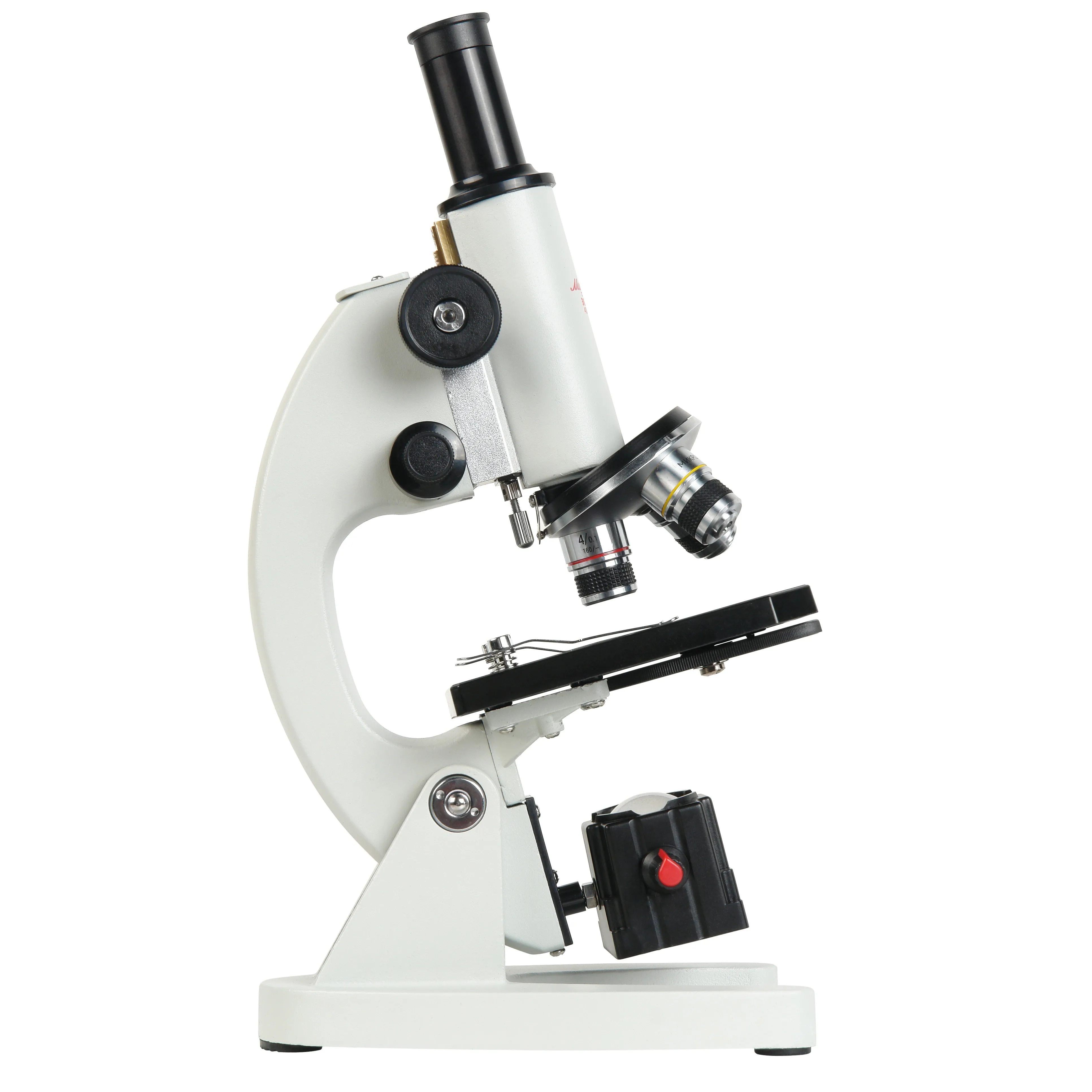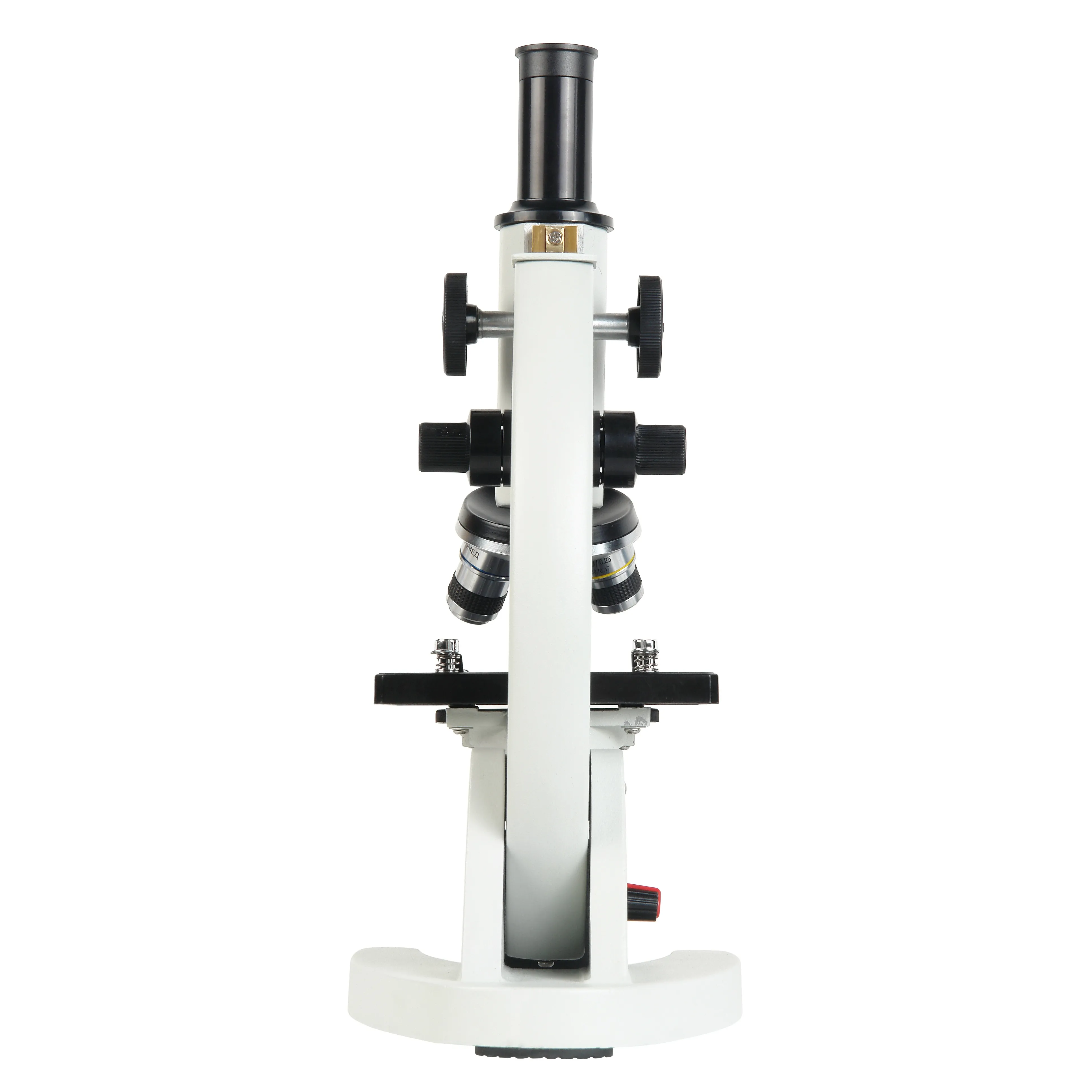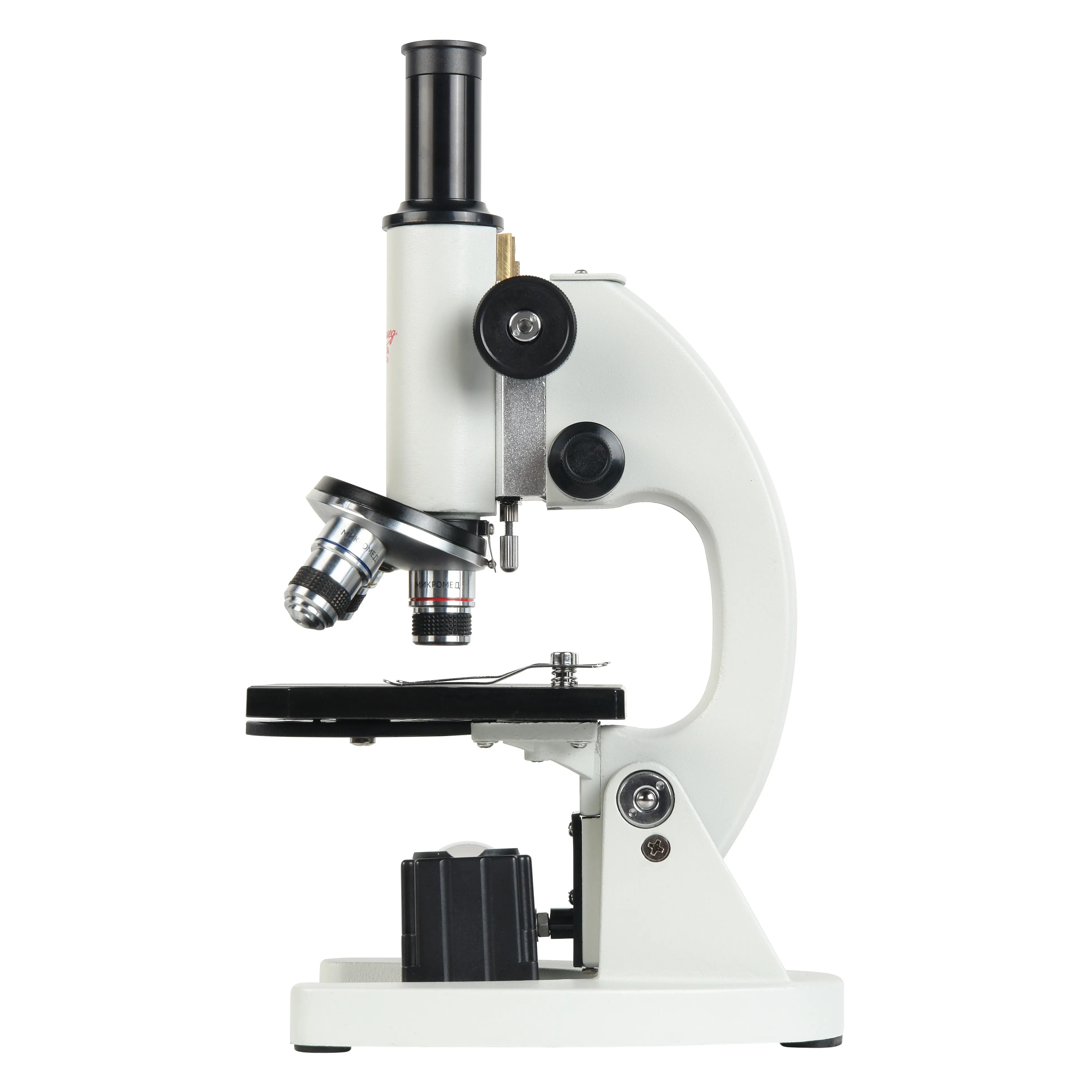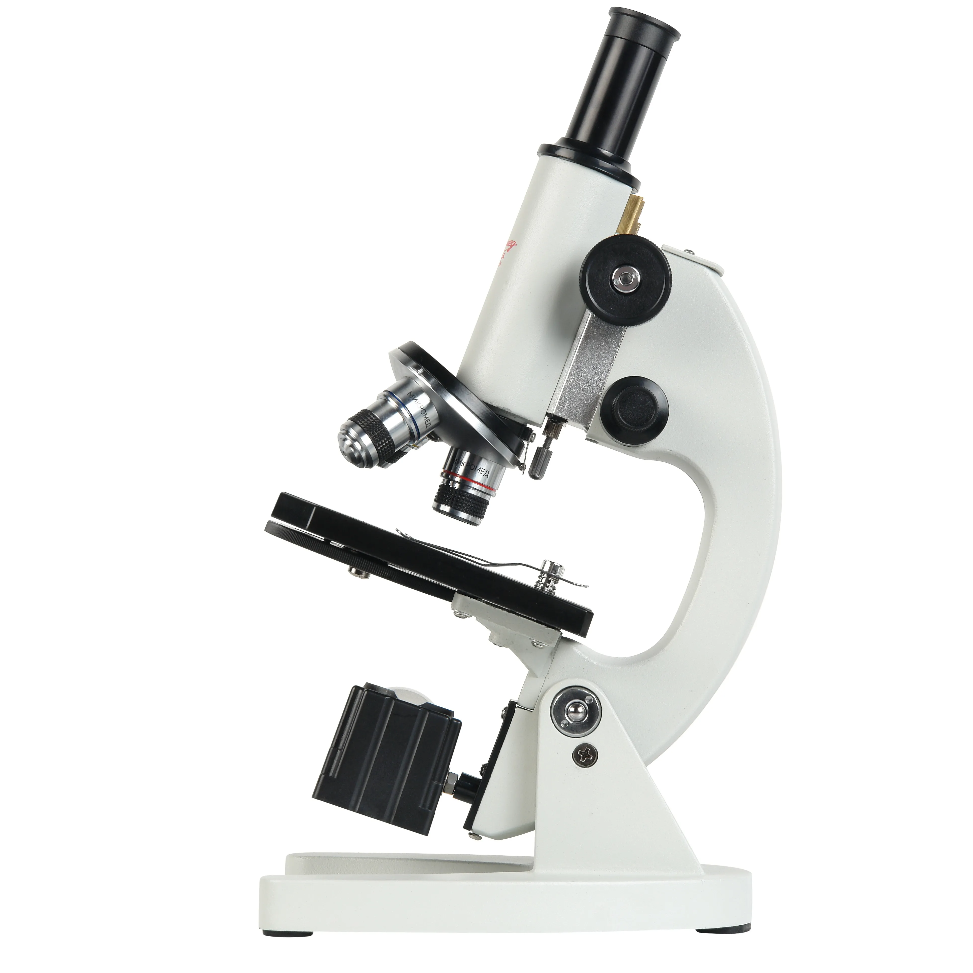 Монокулярный микроскоп для исследований в проходящем свете по методу светлого поля. Увеличения от 40х до 640х. Два осветителя - светодиодный и зеркальный. Ахроматические объективы. Револьверное устройство на 3 объектива. Механизм грубой и тонкой фокусировки.