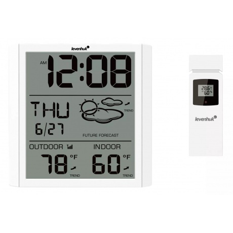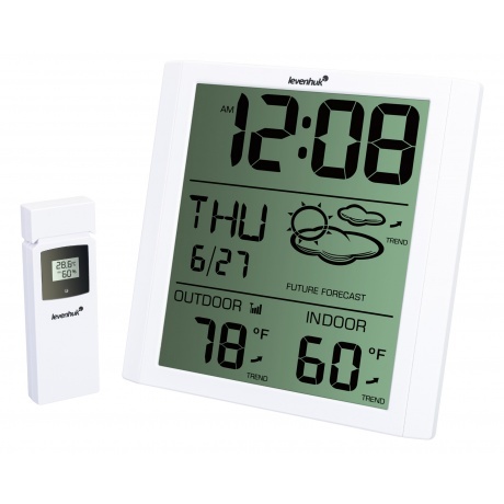 Перед вами термометр Levenhuk Wezzer PLUS LP30 – прекрасный помощник для контроля погоды за окном и микроклимата помещения. Он регистрирует точные значения температуры воздуха внутри и снаружи, измеряет уличную влажность, прогнозирует погоду и определяет тенденции к изменению метеопараметров. Максимальные и минимальные значения сохраняются в памяти термометра. Помимо климатических функций, здесь есть календарь и часы, что очень удобно: прибор сможет заменить собой сразу несколько гаджетов. В комплекте с термометром поставляется внешний беспроводной датчик для измерений на улице. Он определяет температуру и влажность, выводя показания на собственный небольшой экран. Что касается основного блока, в верхней части экрана можно увидеть время, в средней – день недели, дату и иконку прогноза погоды, в нижней – данные температуры внутри помещения и за окном. Стрелочки возле цифр сообщают о том, уменьшается или возрастает значение. Вы всегда будете заранее узнавать о похолодании или потеплении! Кнопки управления вынесены на заднюю стенку, поэтому Levenhuk Wezzer PLUS LP30 выглядит стильно и лаконично. У основного блока есть складная настольная подставка, датчик снабжен настенным креплением.