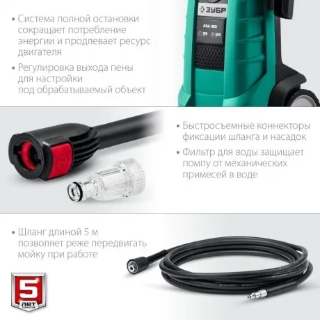 Мойка высокого давления ЗУБР АВД-180 используется для мойки автомобилей, велосипедов и другой колесной техники, садового инвентаря, наружных стен и уличных покрытий. Изделие предназначено для использования только вне помещений. Благодаря системе полной остановки, помпа не работает при не нажатом пистолете - это экономит воду и ресурс изделия при неизбежных паузах в работе. Элегантный дизайн и удобная конструкция с держателями для аксессуаров делают работу с изделием комфортной. Регулировка выходной струи позволяет обрабатывать различные поверхности - автомобили, стены, велосипеды, напольные покрытия и другое.