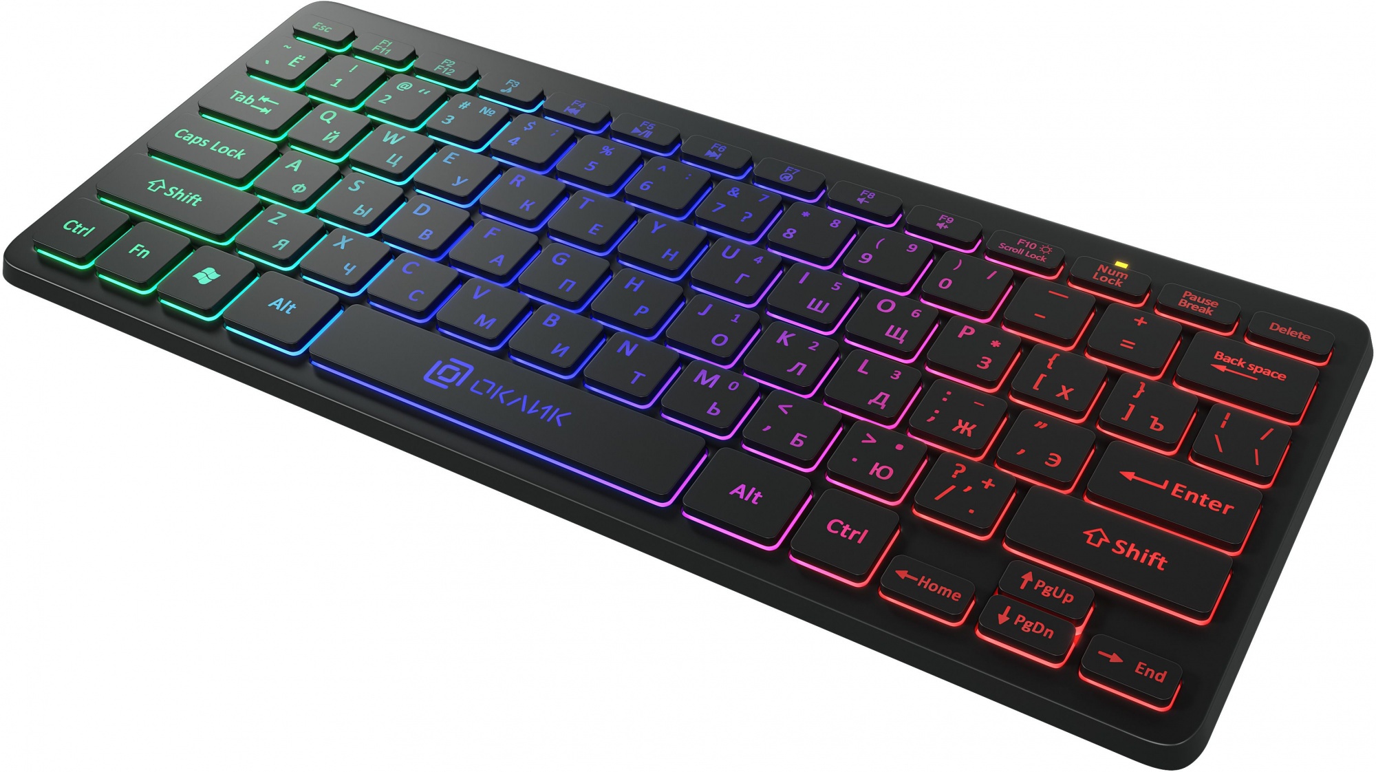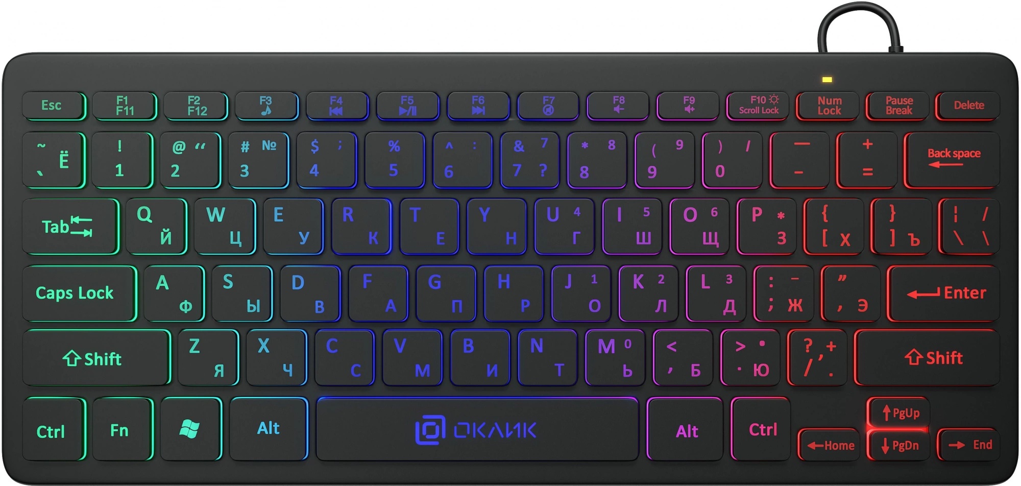 Клавиатура Oklick 300S впечатляет компактными размерами и ярким стильным дизайном благодаря изысканной трехцветной LED-подсветке. Устройство весит всего 260 гр, а его размеры – 28х12х2,5 см. Эта модель подойдет тем, у кого немного места на рабочем столе, и тем, кто часто берет технику с собой в командировки и путешествия.