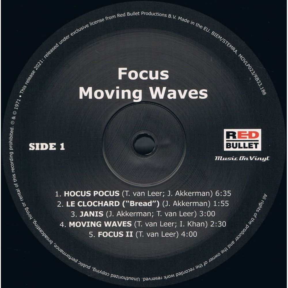 «Focus II» (более известный под международным названием «Moving Waves») - второй студийный альбом голландской прогрессив-рок-группы Focus, выпущенный в октябре 1971 года на лейбле Imperial Records. После ухода басиста Мартина Дрездена и барабанщика Ханса Клевера в 1970 году группа наняла Сирила Хаверманса и Пьера ван дер Линдена, соответственно, и подготовила материал для нового альбома. Focus записали «Focus II» в Лондоне в апреле и мае 1971 года с Майком Верноном в качестве продюсера. В альбом вошли: Hocus Pocus - хард-роковая песня, в которой клавишник Тийс ван Леер исполняет йодлинг, скэт и свист, и Eruption - 22-минутный трек, вдохновленный оперой Эвридика итальянского композитора Якопо Пери. Focus — голландская прогрессив-рок-группа, образованная в Амстердаме в 1969 году клавишником, вокалистом и флейтистом Тийсом ван Леером, барабанщиком Хансом Клеувером, басистом Мартейном Дрезденом и гитаристом Яном Аккерманом. Группа претерпела множество изменений за свою историю, с декабря 2016 года в его состав входят Ван Леер, барабанщик Пьер ван дер Линден, гитарист Менно Гутьес и басист Удо Паннекит. Они продали один миллион альбомов, сертифицированных RIAA, в Соединенных Штатах.