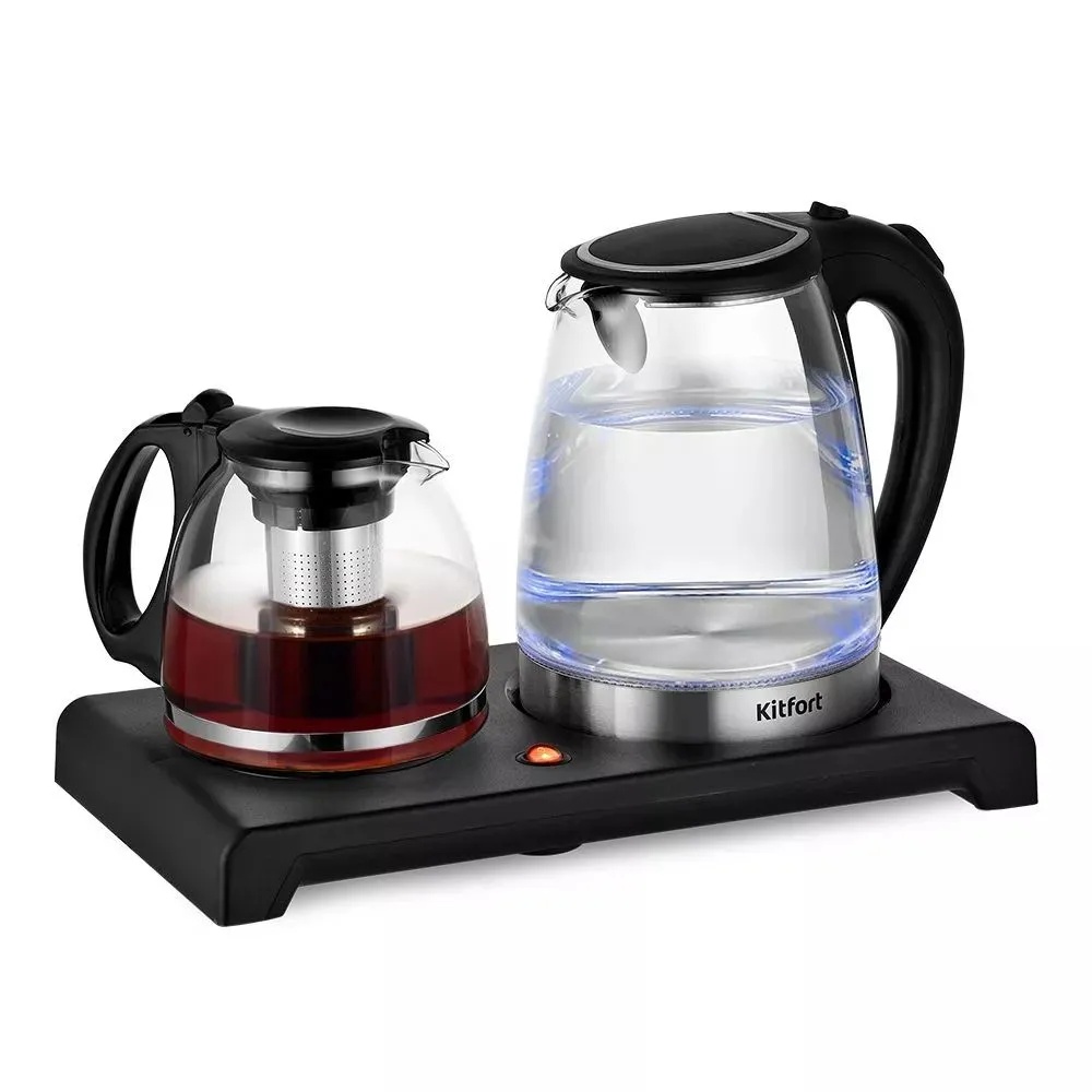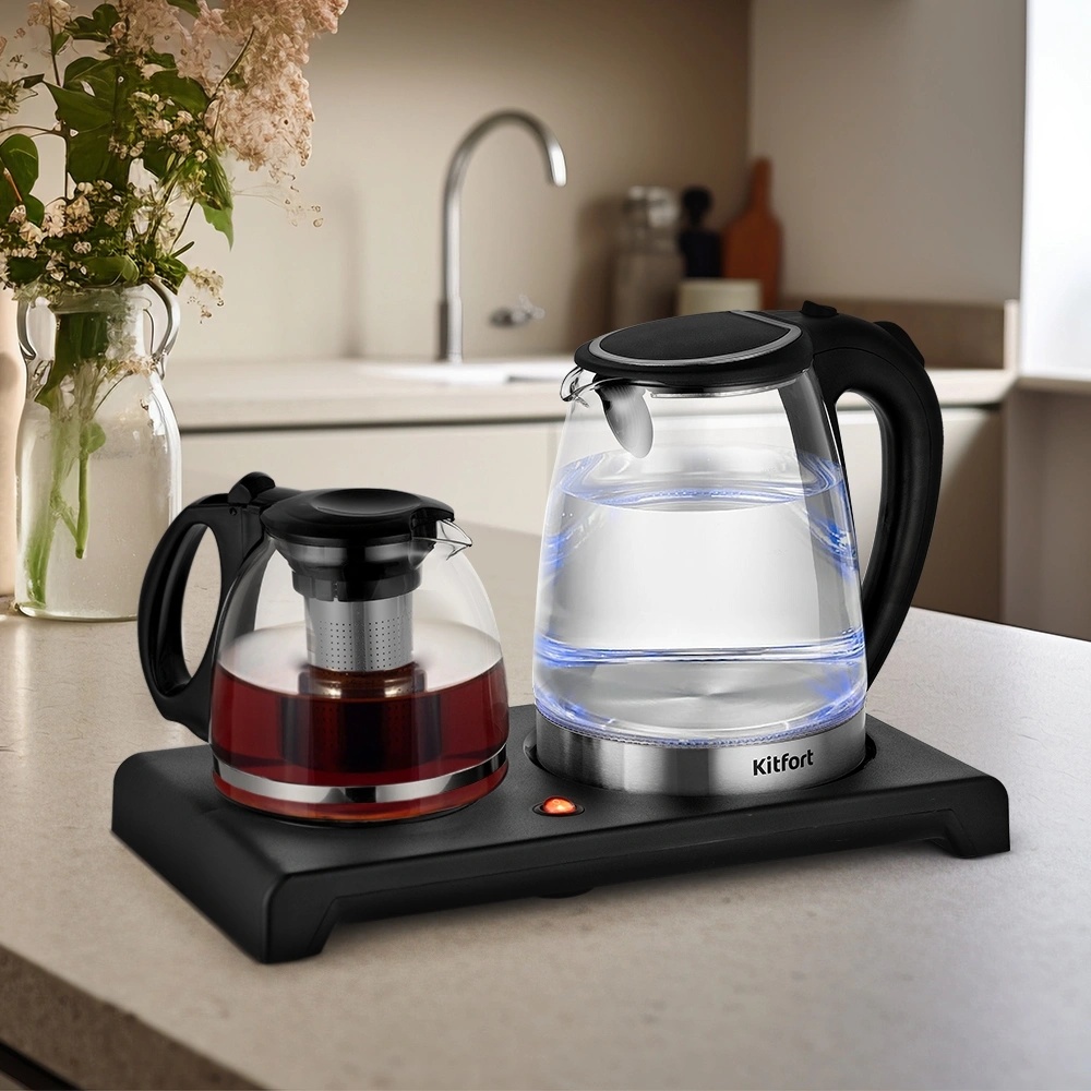 Стильный и функциональный чайный набор Kitfort КТ-6180 состоит из чайника ёмкостью 2 л, кувшина с фильтром для заварки ёмкостью 1,2 л и базы. Набор поможет вам не только вскипятить воду, но и заварить чай или кофе. Корпус чайника выполнен из стекла со вставкой из пластика. Крышка выполнена из сочетания нержавеющей стали и пластика. Мерная шкала находится на боковой стороне. Конструкция чайника не позволяет ручке нагреваться, поэтому браться за неё безопасно. Кувшин для заварки изготовлен из термостойкого стекла и имеет съёмный фильтр для чая или кофе. В месте установки кувшина на базу присутствует скрытый нагревательный элемент с функцией поддержания тепла. На базе расположена кнопка включения поддержания тепла, а сама база изготовлена из пластика. На ней компактно располагается чайник и кувшин. Небольшие габариты чайной станции позволяют расположить её практически в любое удобное место.