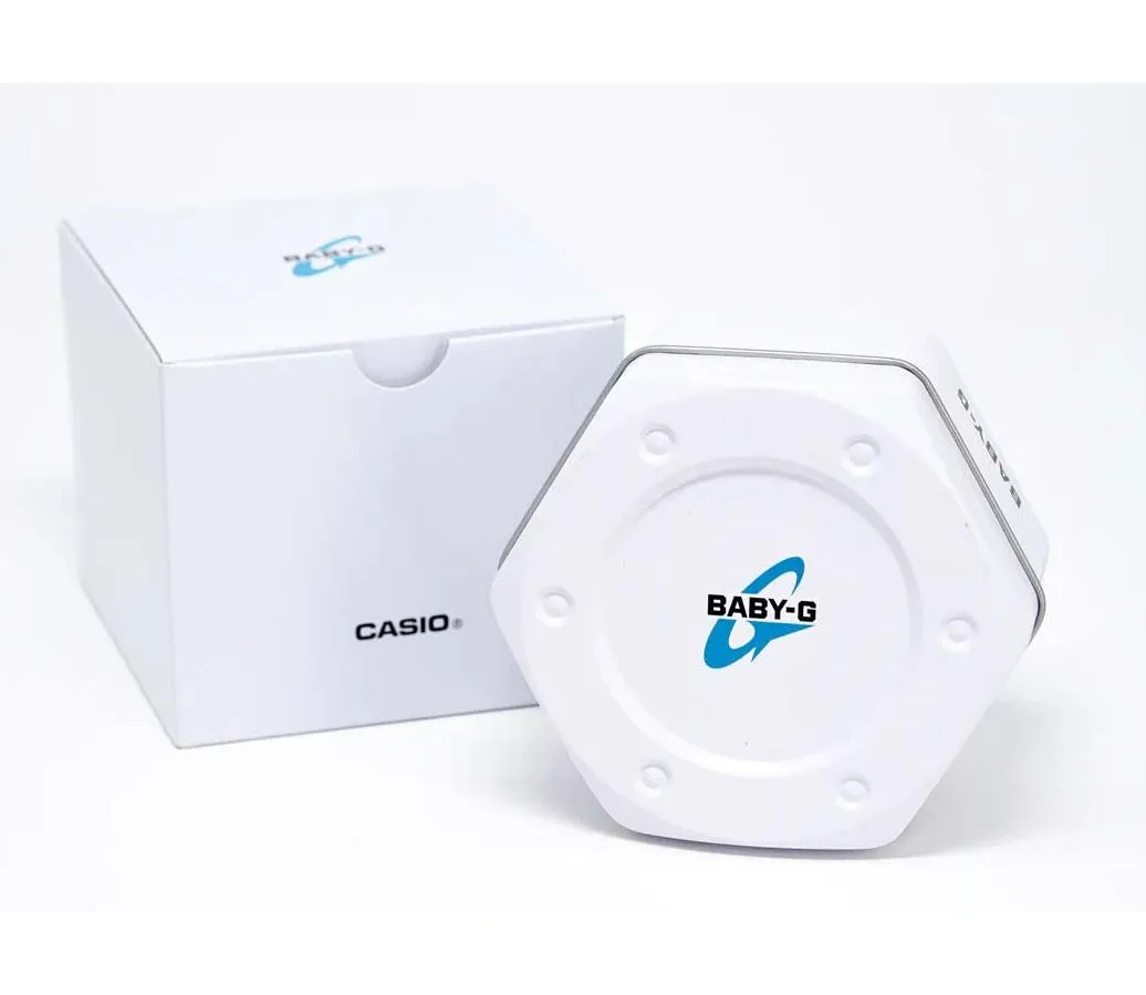 Спортивные женские часы Casio Baby-G. 12-ти и 24-х часовой формат отображения времени. Секундомер с шагом 1/100 сек. и временем измерения 1 час. Таймер обратного отсчета от 1 минуты до 24 часов. Мировое время 31 часовой пояс (48 городов + всемирное координированное время), отображение кода города, отображение названия города, включение/выключение перехода на летнее время, автоматическое переключение на летнее время (DST). 5 ежедневных будильников, ежечасный сигнал. Светодиодная подсветка, выбираемая продолжительность подсветки (1,5 или 3 секунды), послесвечение). Питание от батарейки CR1025, примерный срок работы 3 года. Задняя крышка из нержавеющей стали с креплением к корпусу на винтах. Ремешок с классической застежкой. Вес часов 33 грамма.