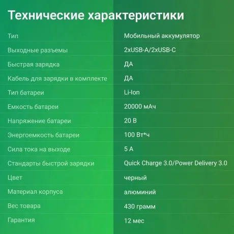 Внешний аккумулятор Digma DGPD100WA обладает впечатляющей ёмкостью 20 000 мАч, что позволяет многократно заряжать различные устройства. Он оснащён двумя портами USB-A и двумя USB-C, позволяя одновременно заряжать до трёх устройств. Благодаря поддержке стандартов быстрой зарядки Power Delivery 3.0 и Quick Charge 3.0, аккумулятор способен быстро пополнять заряд батареи ваших приборов. Подходит для ноутбука.