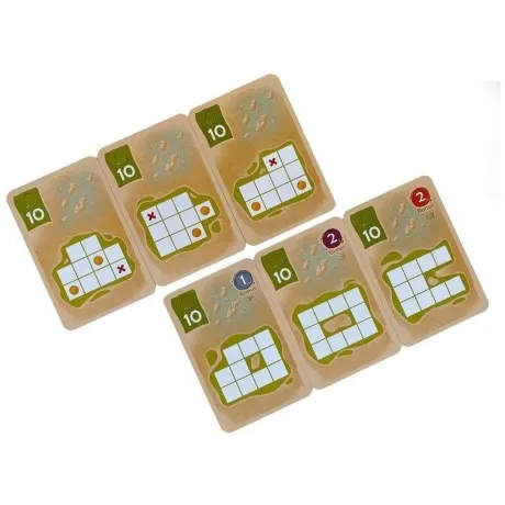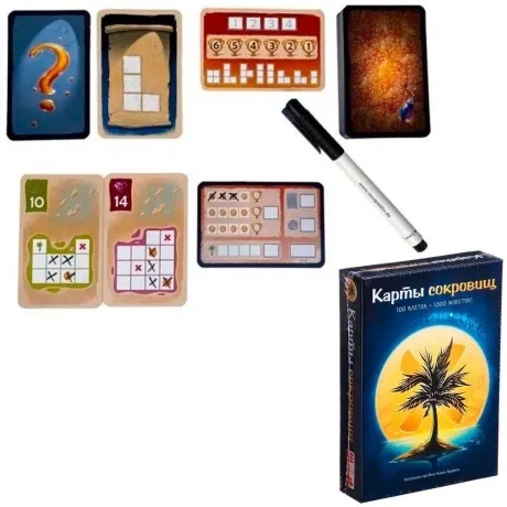 47 карт сокровищ, 8 карт экспедиций, 4 карты подсчёта, 1 карта раундов, 4 фломастера, правила игры