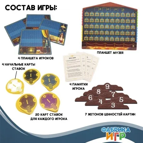 4 планшета игроков, 4 памятки игроков, 1 планшет музея, 116 жетонов картин, 7 жетонов ценности картины, 108 жетонов украшений, 20 карт ставок на каждого игрока, 4 начальные карты ставок, 4 маркера престижа, 4 жетона наград, 2 маркера победных очков, 1 молоточек аукциониста, правила игры