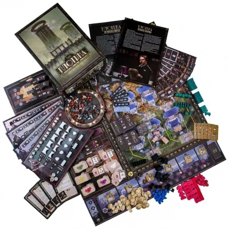 игровое поле, планшет руководства, шкала энергии, планшет патентного бюро, 8 жетонов истоков рек, 10 жетонов начальной подготовки, 6 жетонов бонусов, 6 жетонов целей, 45 жетонов частных контрактов, 6 жетонов государственных контрактов, 15 жетонов новаторских технологий, 3 нейтральных основания, 3 нейтральные насыпи, 30 капель воды, 58 гидроэлектрических кредитов, 34 экскаватора, 26 бетоносмесителей, 4 планшета компаний, 4 колеса строительства, 4 жетона начальных контрактов, 7 жетонов управляющих