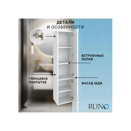 Шкаф-пенал для ванной Runo Стокгольм 35 правый 00-00001125 с двумя отделениями и распашными дверками. В верхнем отделении две встроенные полки, в нижнем одна. Выпускается только в правом исполнении.