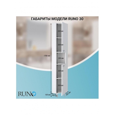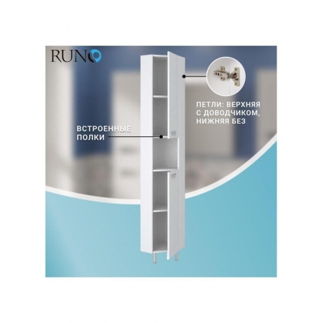 Пенал RUNO 30 угловой 00000000290 функциональное решение для недорогого и современного оснащения ванной комнаты. Шкаф выполнен в белом цвете, идеально впишется в любой интерьер ванной комнаты. Изделие имеет две распашные дверцы, в нижнем и верхнем отделениях по одной встроенной полке и открытую нишу посередине. В комплекте идут петли со встроенным доводчиком, 2 ручки, 2 хромированные и 2 пластиковые ножки. Мебель для ванной RUNO красота и практичность в мелочах!