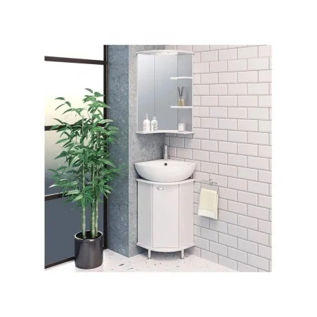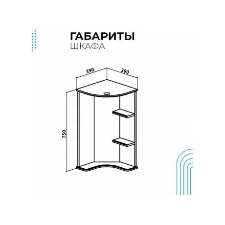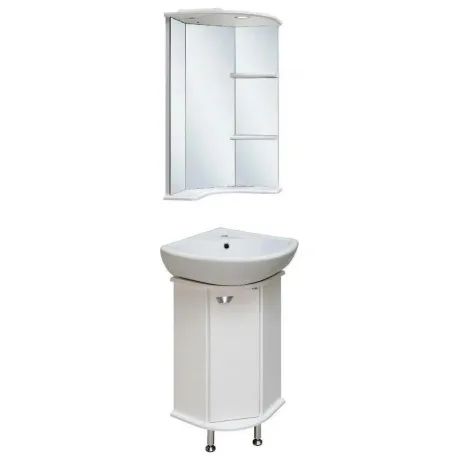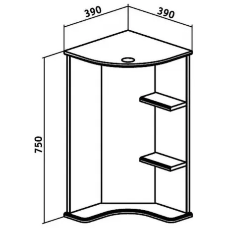 Угловое навесное зеркало с козырьком и нижней полкой. Оборудовано одним врезным светодиодным светильником 220В, розеткой с выключателем. Справа две открытые полочки.