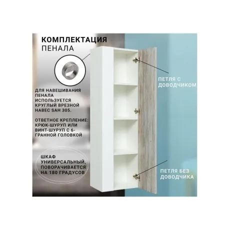 Шкаф-колонна подвесной с распашной дверью, за которой три внутренние полки. Петли со встроенным доводчиком. Шкаф универсальный: установка возможна как слева направо открывающейся дверью, так и наоборот.