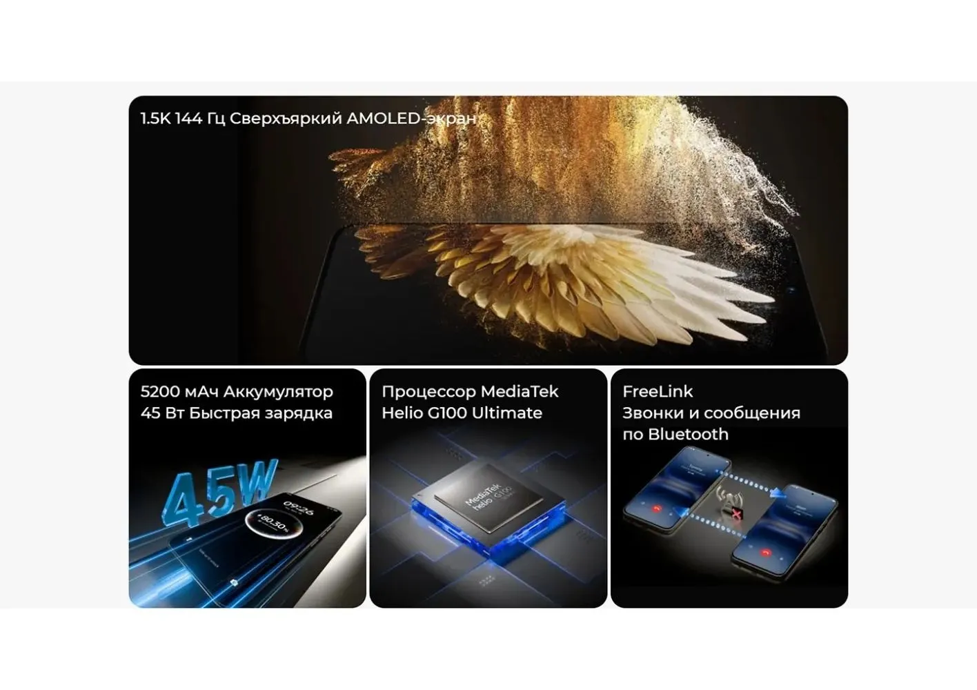 Tecno SPARK 40 Pro смартфон с улучшенной производительностью, поддержкой фирменного ИИ. Тонкий, элегантный и надёжный смартфон, устойчивый к падениям. Мощный восьмиядерный процессор MediaTek Helio G100 Ultimate дополнен большим объёмом постоянной и оперативной памяти для эффективной и многозадачной работы. Прямой AMOLED-экран диагональю 6.78” со сверхчётким разрешением 1.5K защищён закалённым стеклом Gorilla Glass 7i. Частота обновления до 144 Гц обеспечивает отличную динамику и плавную прокрутку контента, сохраняя как можно дольше максимальную энергоэффективность смартфона. Яркость до 4500 нит позволяет с комфортом пользоваться смартфоном даже в солнечный день. Вместе со стереодинамиками с объёмным звуком Dolby Atmos и возможностью подключения беспроводных наушников через Bluetooth 5.4 или проводных — через Mini Jack 3.5 мм легко окунуться с головой в мир просматриваемого контента. Модель оснащена фирменным искусственным интеллектом TECNO AI с умным ассистентом Ella. Она умеет общаться и распознавать голосовые команды на русском языке, выполняет разные запросы — от удаления лишних объектов на фото до вызова такси. Смартфон также умеет с помощью TECNO AI генерировать и редактировать тексты, осуществлять поиск информации как на устройстве, так и в интернете. Корпус смартфона с равномерно скошенными углами имеет высокую ударопрочность и полную защиту от попадания пыли, а также случайных брызг воды по стандарту IP64. Тонкий корпус 6.69 мм и лёгкий вес 170 граммов делают SPARK 40 Pro одним из самых изящных и эргономичных устройств на рынке смартфонов.
