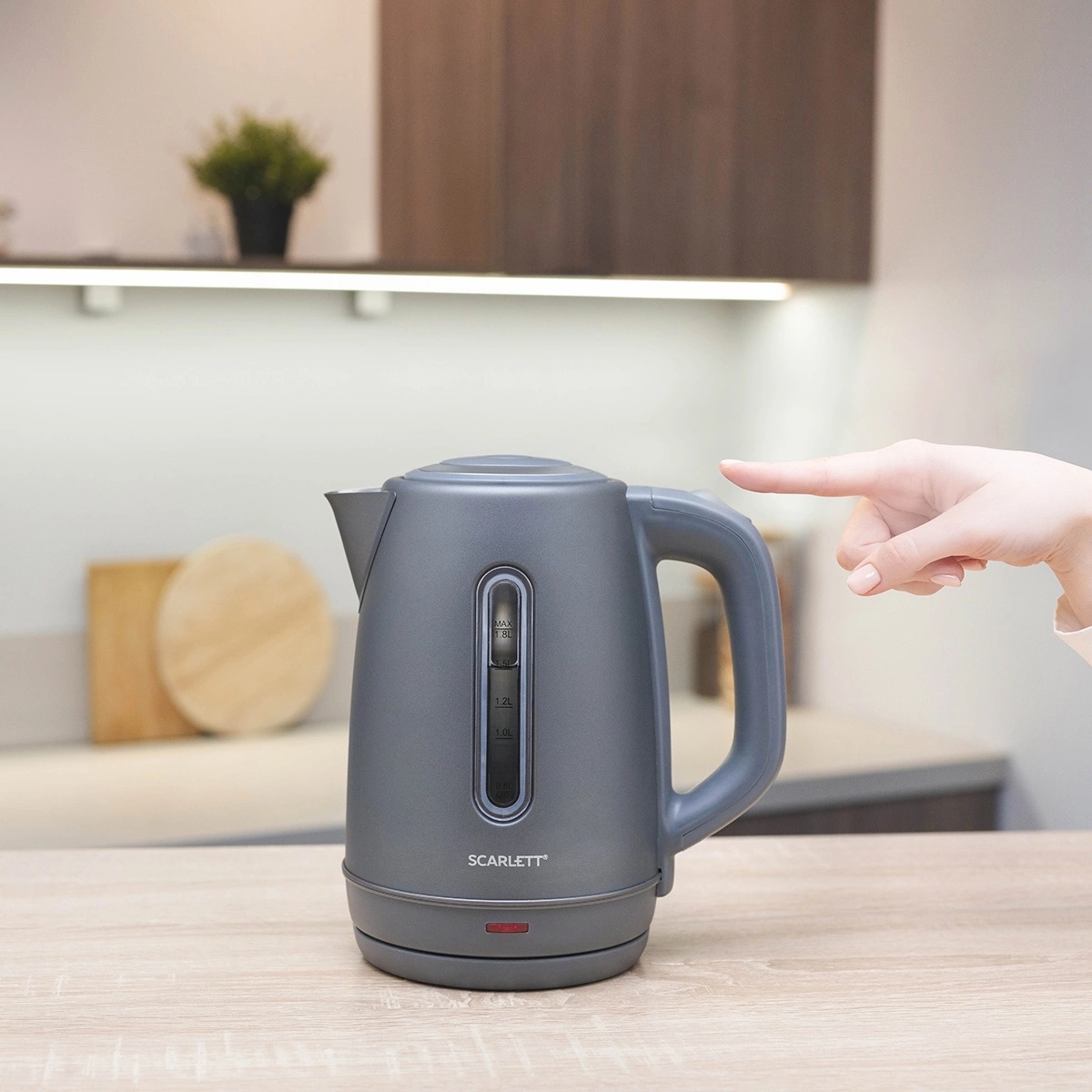 Scarlett SC-EK21S42 – электрический чайник мощностью 1800 Вт и объемом 1.8 л оснащён автоматической системой открывания крышки.