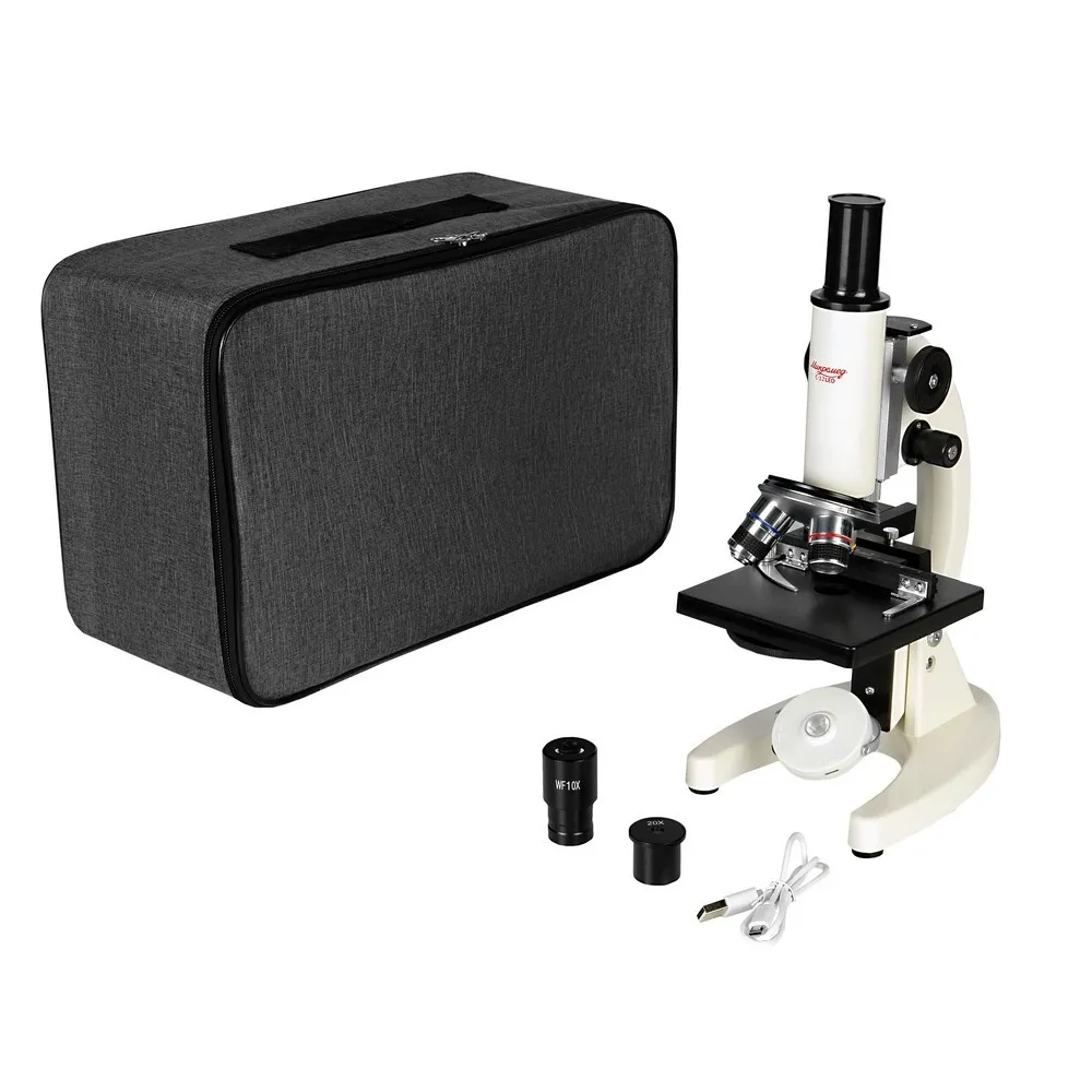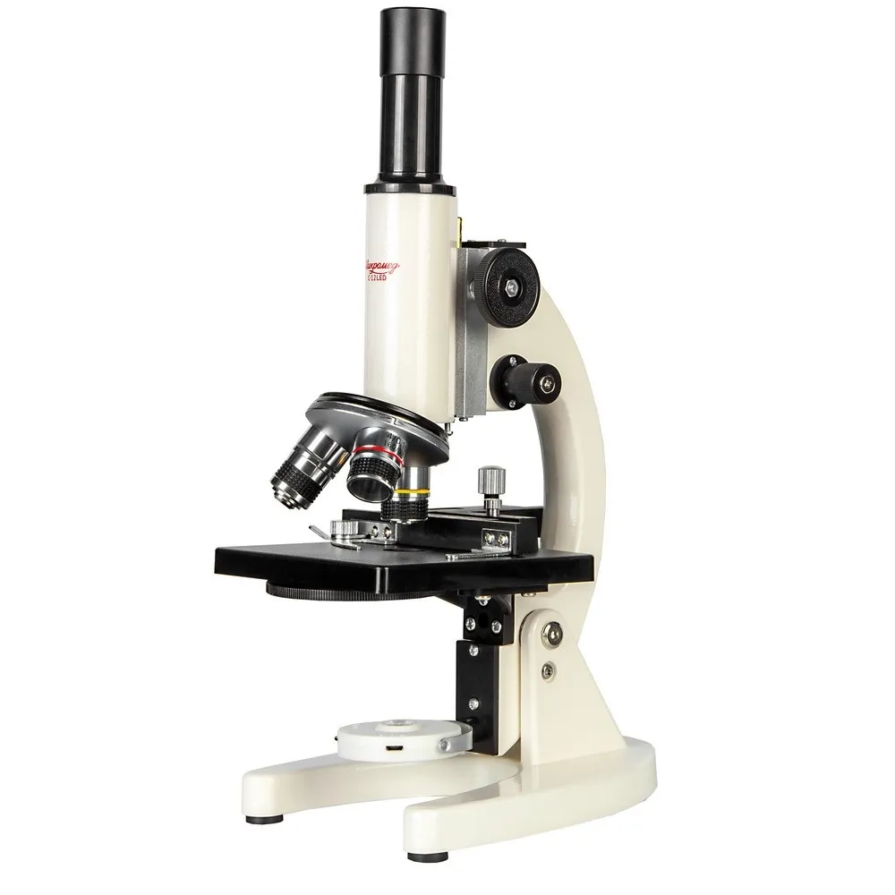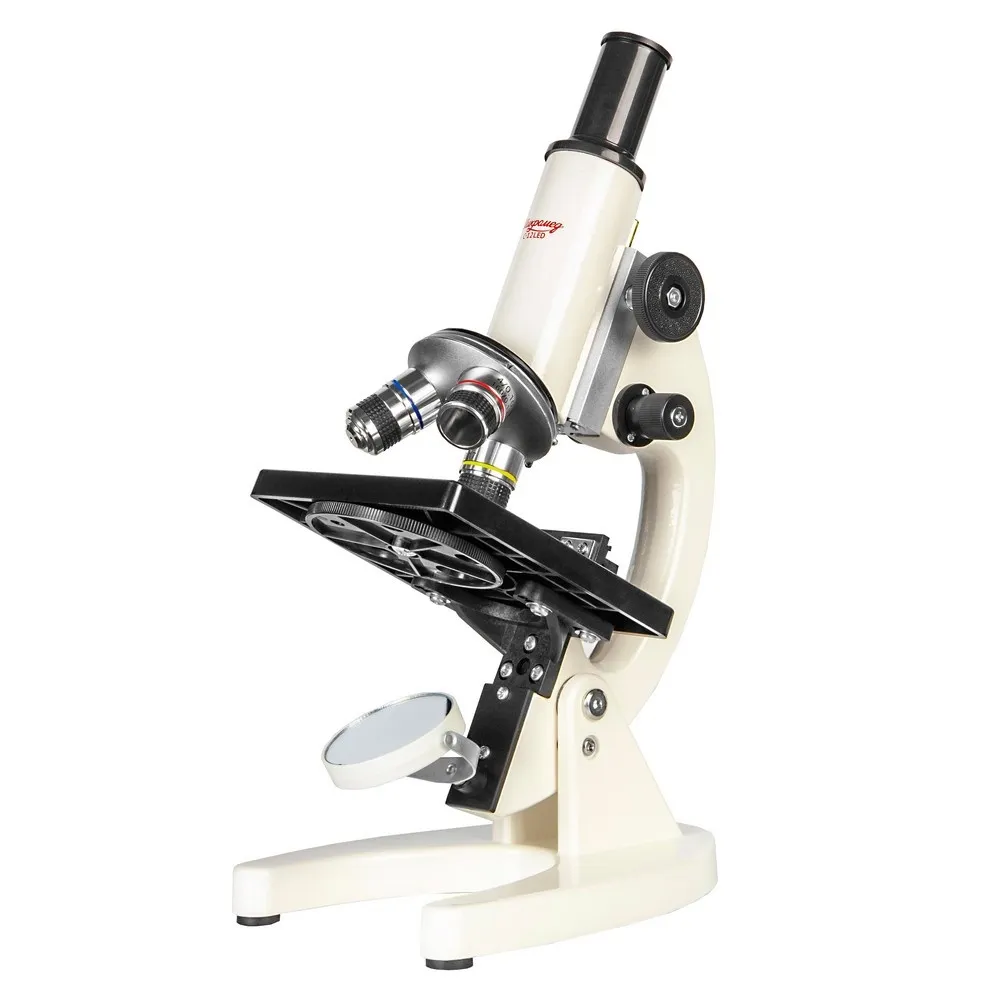 Для освещения исследуемого препарата используется поворотное зеркало со светодиодной подсветкой от встроенного аккумулятора. Микроскоп оборудован предметным столиком с механическим держателем для точного перемещения препарата во взаимно – перпендикулярных направлениях. С помощью микроскопа можно изучать срезы тканей, мазки, прозрачные минералы, кристаллы и многое другое.