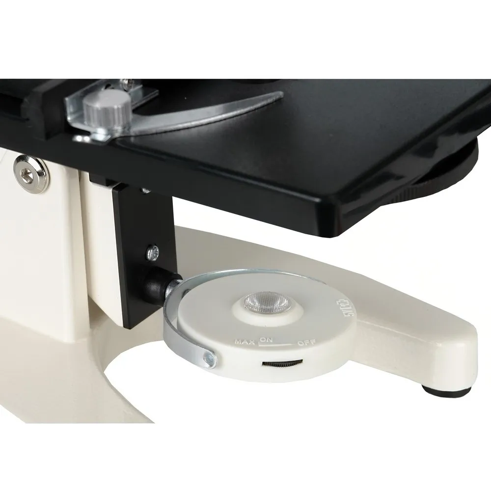 Необходимый вид освещения можно выбрать исходя из условий наблюдений, для этого просто нужно повернуть осветитель. При наклоне штатива с окулярным тубусом на комфортный для наблюдений угол, также наклоняется и осветитель микроскопа, поэтому никаких дополнительных настроек не требуется.