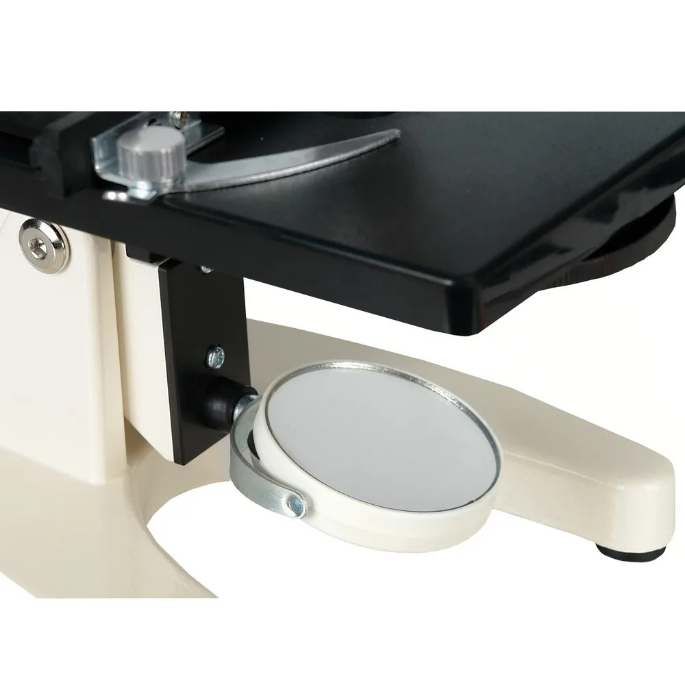 Зеркальный осветитель микроскопа позволяет использовать в качестве источника света любой внешний источник – настольную лампу, фонарь, свет из окна или прямой солнечный свет. Для того, чтобы точно направить внешний свет на исследуемый образец, зеркало установлено на кронштейне, вращающимся в двух плоскостях.