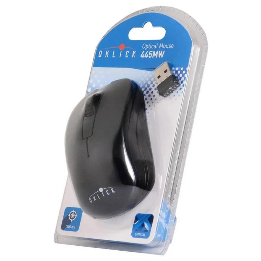 Мышь беспроводная Oklick 445MW подойдет для решения любых задач. Этот компактный манипулятор можно подключать к любому компьютеру, оборудованному USB-портом. Приемник беспроводного сигнала миниатюрен: его подключение к мобильному или стационарному компьютеру не стеснит вас. Радиус действия беспроводной связи может достигать 10 м: вы сможете с комфортом пользоваться мышью в большом помещении. Значительная дальность передачи сигнала может быть полезна при проведении презентаций или при просмотре фильмов.Корпус мыши Oklick 445MW симметричен: пользоваться устройством можно как правой, так и левой рукой. Для питания модели используется батарейка широко распространенного типа AA. Можно использовать и аккумуляторы соответствующего типа.Матовый пластик, из которого изготовлен корпус манипулятора, окрашен в черный цыет. Сенсор мыши – оптический светодиодный. Разрешение оптического датчика равно 1200 dpi: вы будете довольны точностью позиционирования курсора. Габаритные размеры корпуса мыши равны 57x35x97.5 мм. Масса манипулятора невысока: она равна 57 г. Мышь беспроводная Oklick 445MW имеет компактную упаковку, которую легко вскрыть.